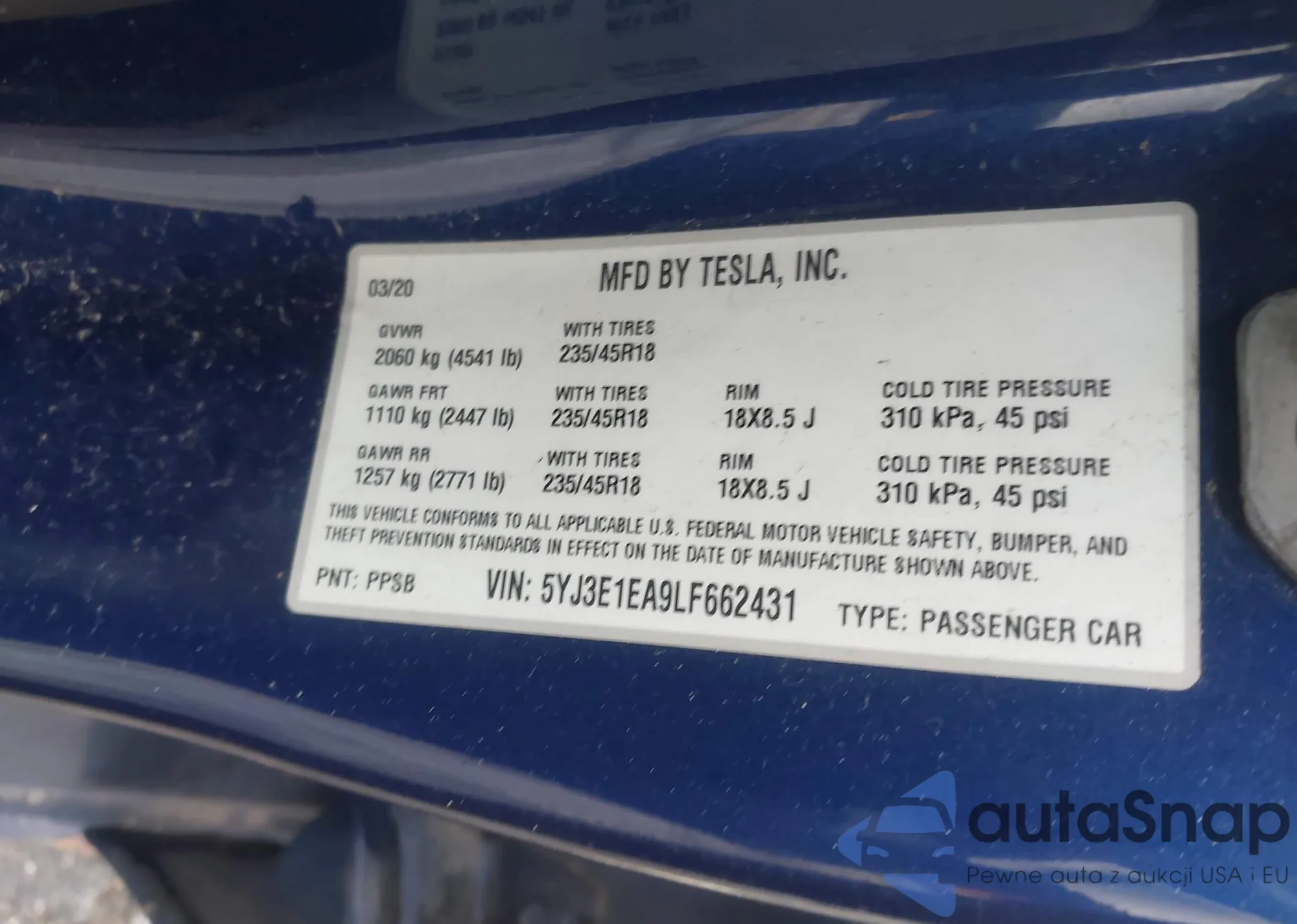 Автомобиль Tesla Model 3 2020 (VIN 5YJ3E1EA9LF662431) ранее не участвовал в торгах. Документы чистые, пробег соответствует или ниже среднего по рынку. Продаётся страховой компанией — рекомендуем покупку. Доставка в порт займет около 6–8 недель.