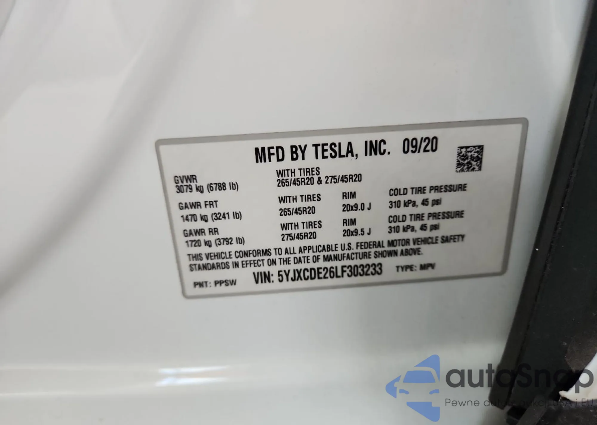 Автомобиль Tesla Model X 2020 (VIN 5YJXCDE26LF303233) имеет документы, препятствующие регистрации. Могут возникнуть сложности при экспорте и регистрации. Обратитесь к экспертам AutaSnap для поиска альтернатив.