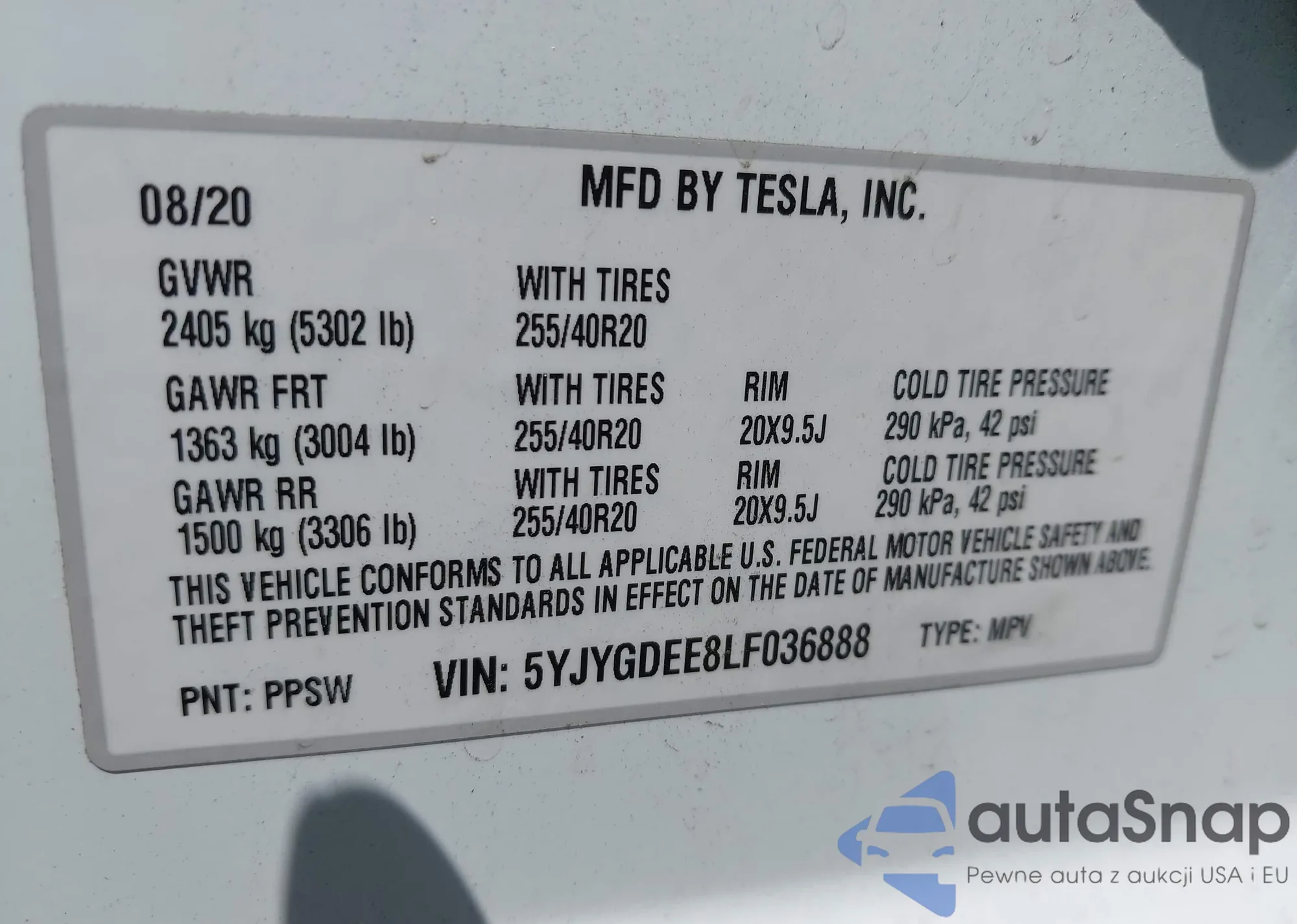 Автомобиль Tesla Model Y 2020 (VIN 5YJYGDEE8LF036888) имеет документы, препятствующие регистрации. Могут возникнуть сложности при экспорте и регистрации. Обратитесь к экспертам AutaSnap для поиска альтернатив.