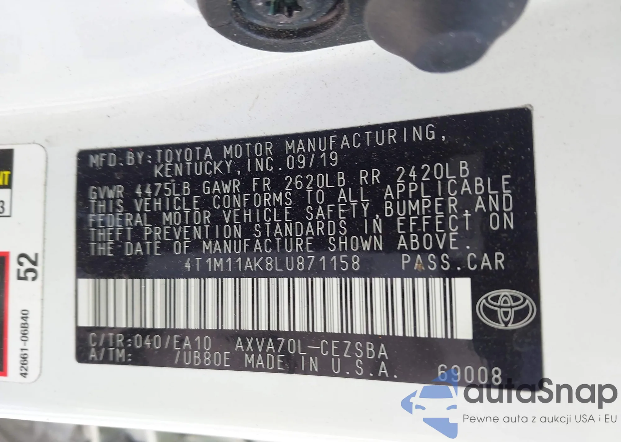 Автомобиль Toyota Camry 2020 (VIN 4T1M11AK8LU871158) имеет документы, препятствующие регистрации. Могут возникнуть сложности при экспорте и регистрации. Обратитесь к экспертам AutaSnap для поиска альтернатив.