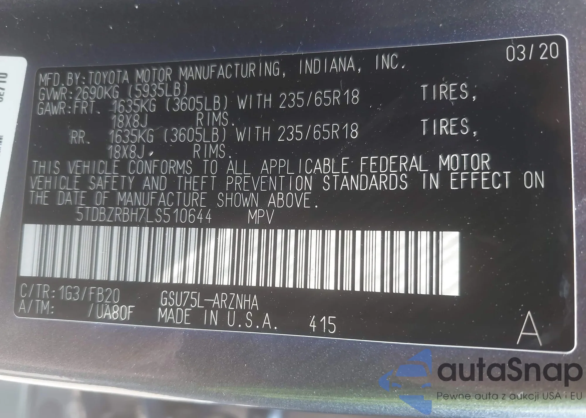 VIN: 5TDBZRBH7LS510644