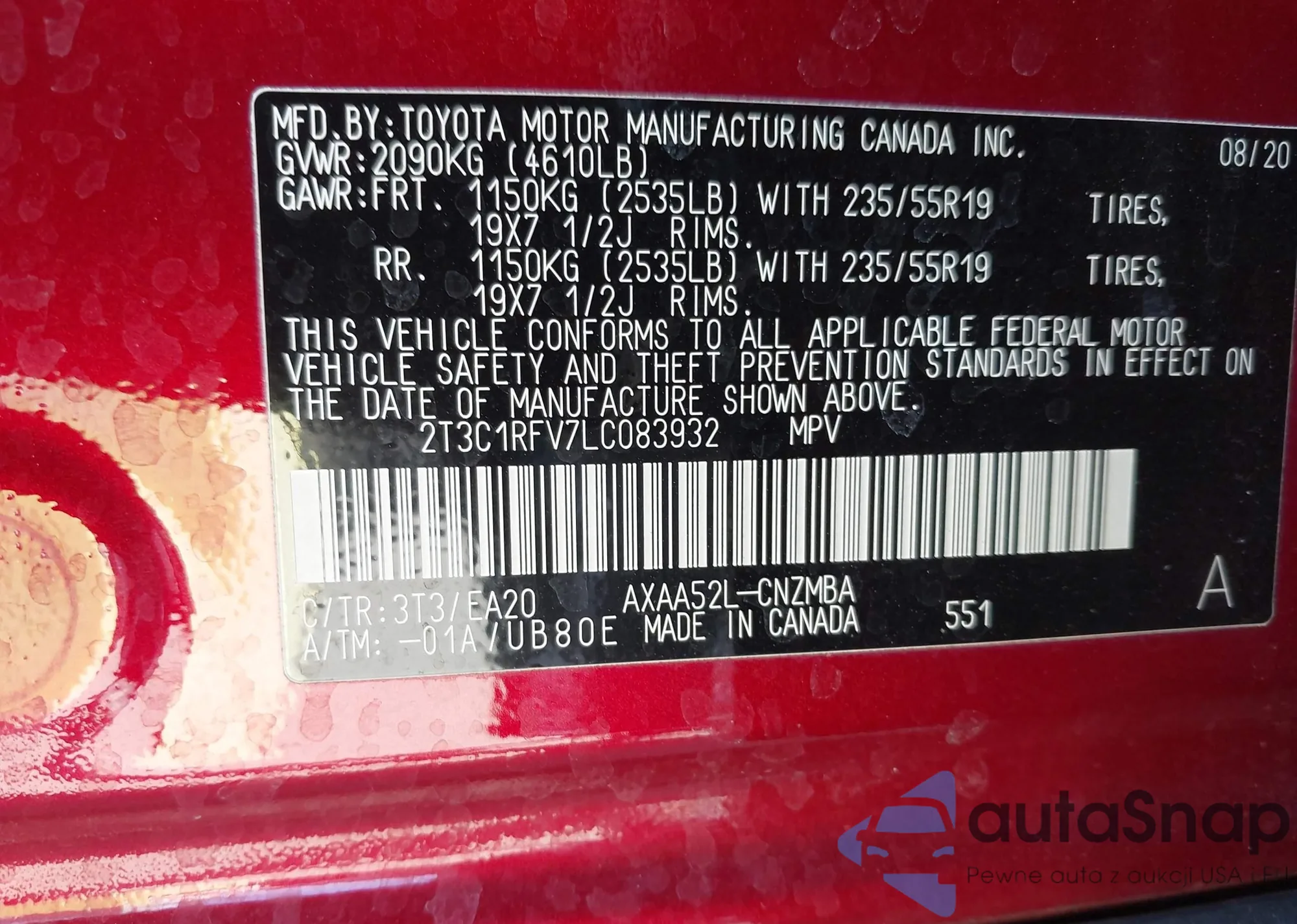 Автомобиль Toyota RAV 4 2020 (VIN 2T3C1RFV7LC083932) имеет документы, препятствующие регистрации. Могут возникнуть сложности при экспорте и регистрации. Обратитесь к экспертам AutaSnap для поиска альтернатив.
