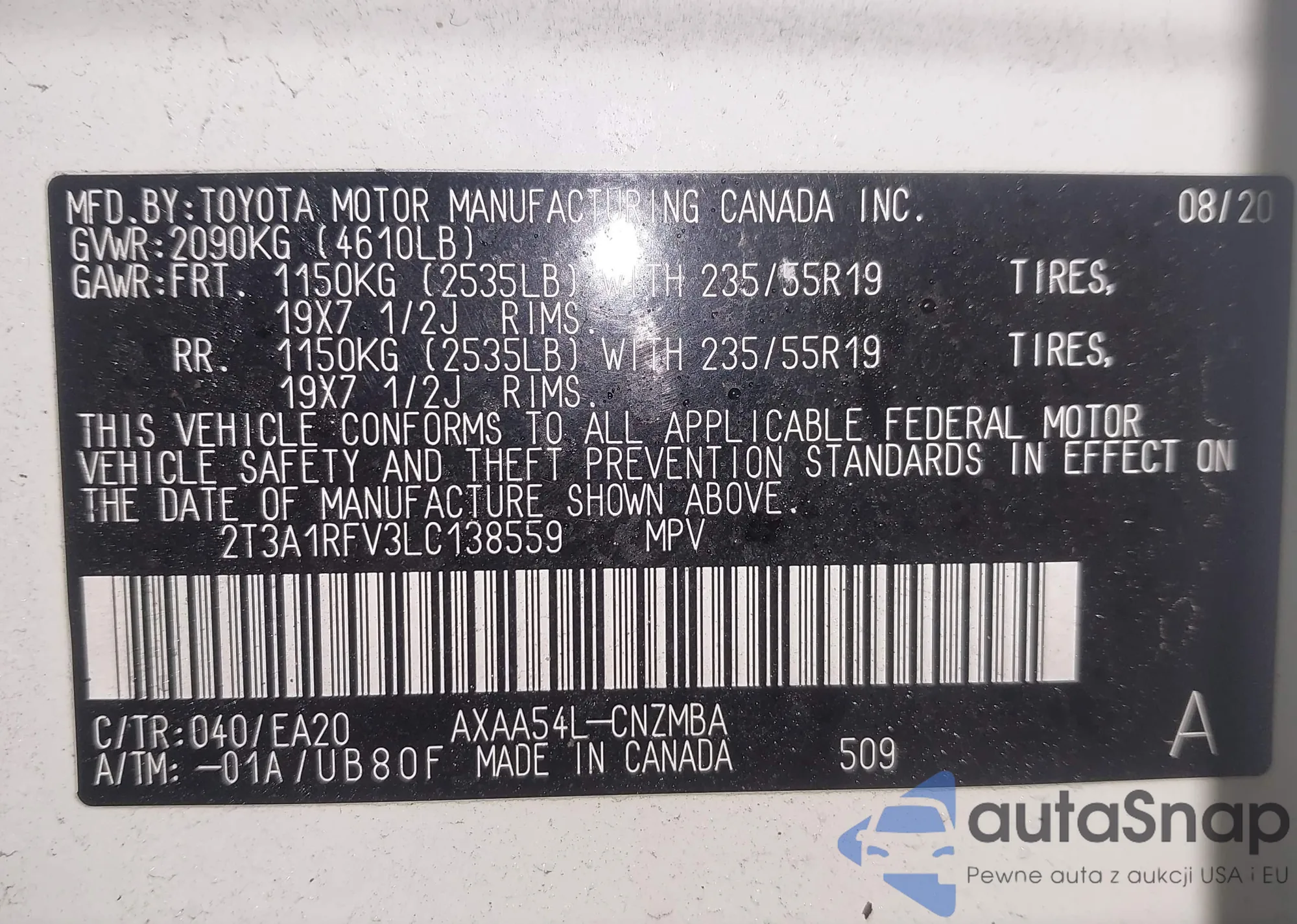 Автомобиль Toyota RAV 4 2020 (VIN 2T3A1RFV3LC138559) ранее не участвовал в торгах. Документы чистые, пробег соответствует или ниже среднего по рынку. Продаётся страховой компанией — рекомендуем покупку. Доставка в порт займет около 6–8 недель.
