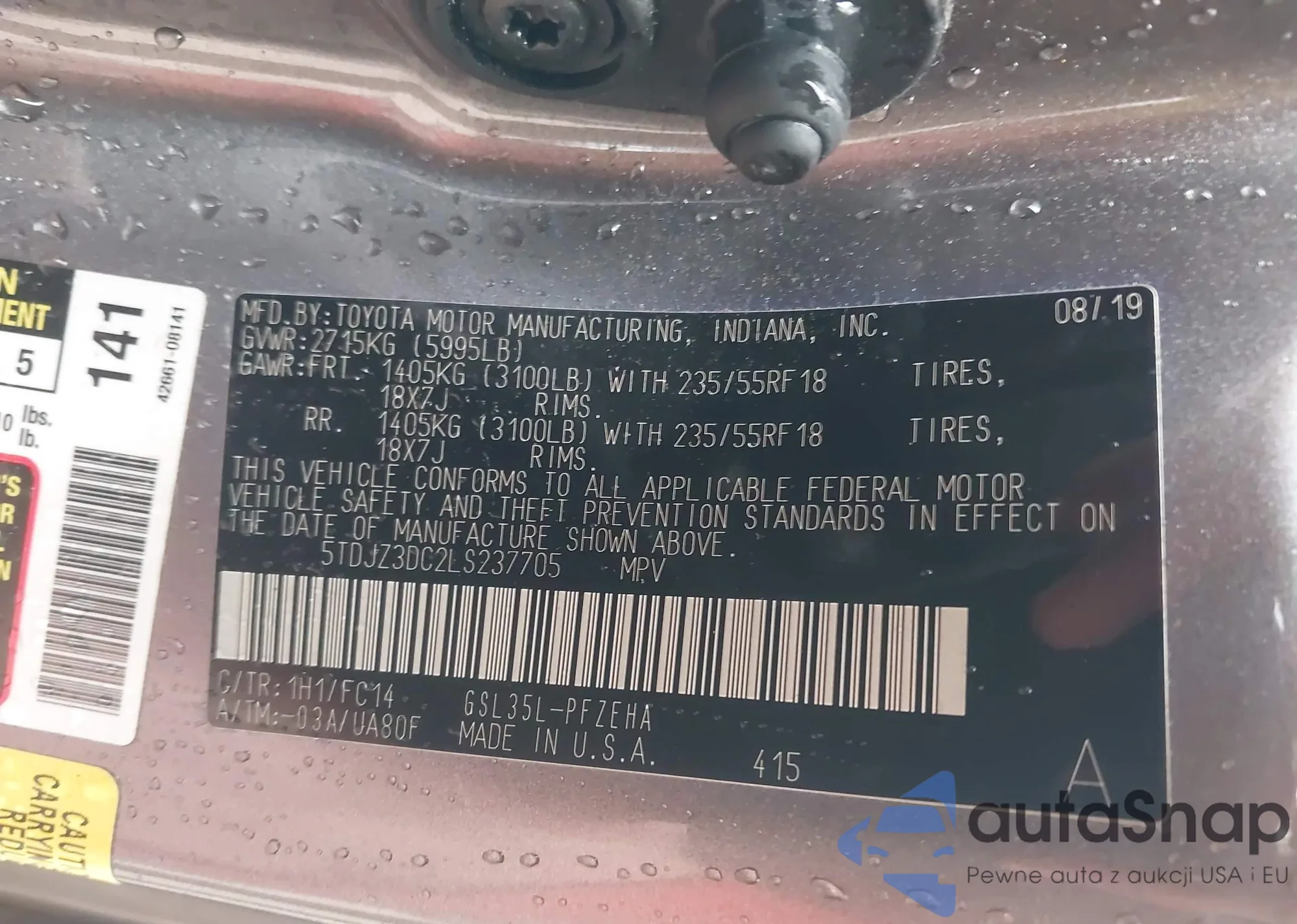 Автомобиль Toyota Sienna 2020 (VIN 5TDJZ3DC2LS237705) ранее не участвовал в торгах. Документы чистые, пробег соответствует или ниже среднего по рынку. Продаётся страховой компанией — рекомендуем покупку. Доставка в порт займет около 6–8 недель.