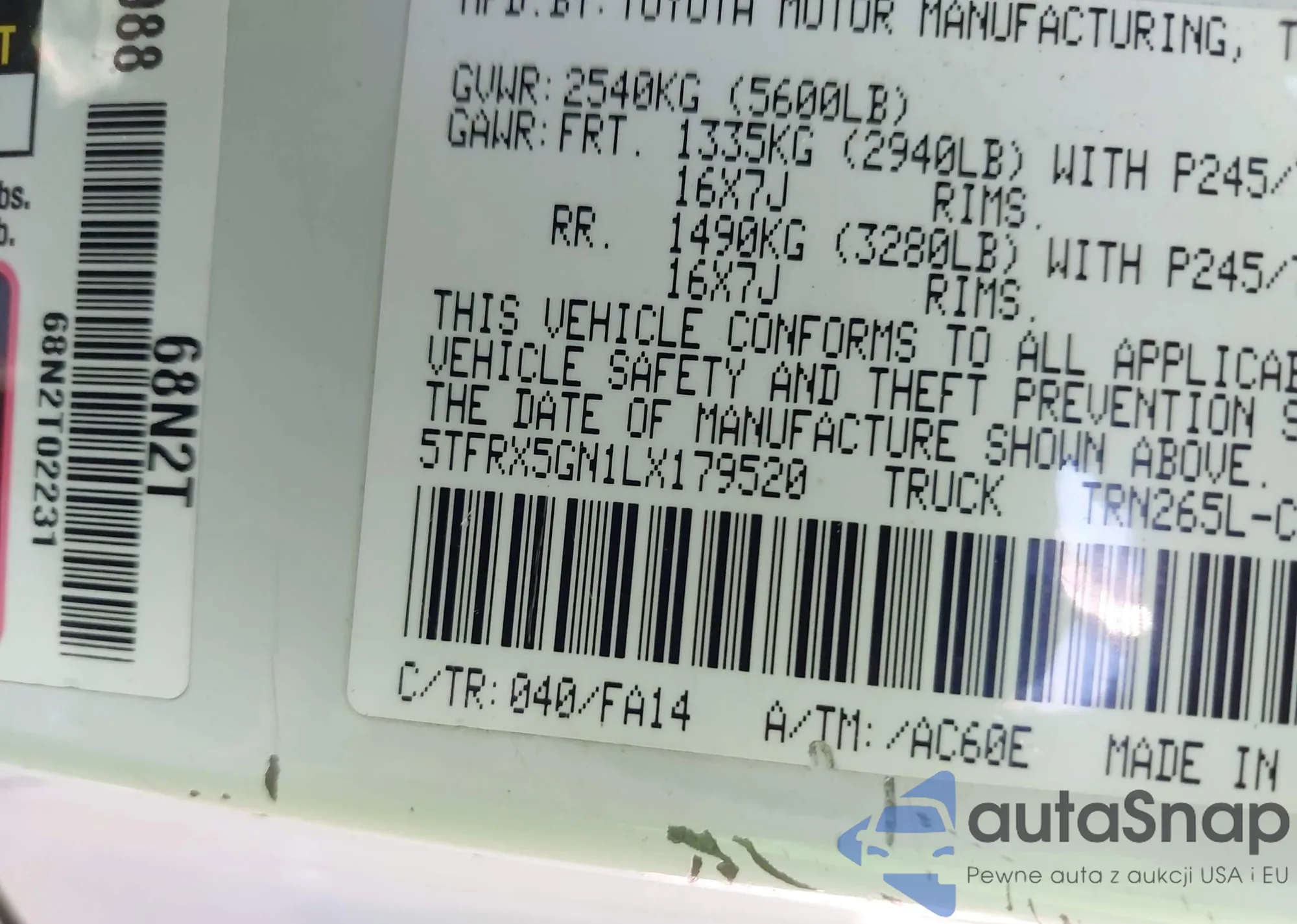 • VIN: 5TFRX5GN1LX179520