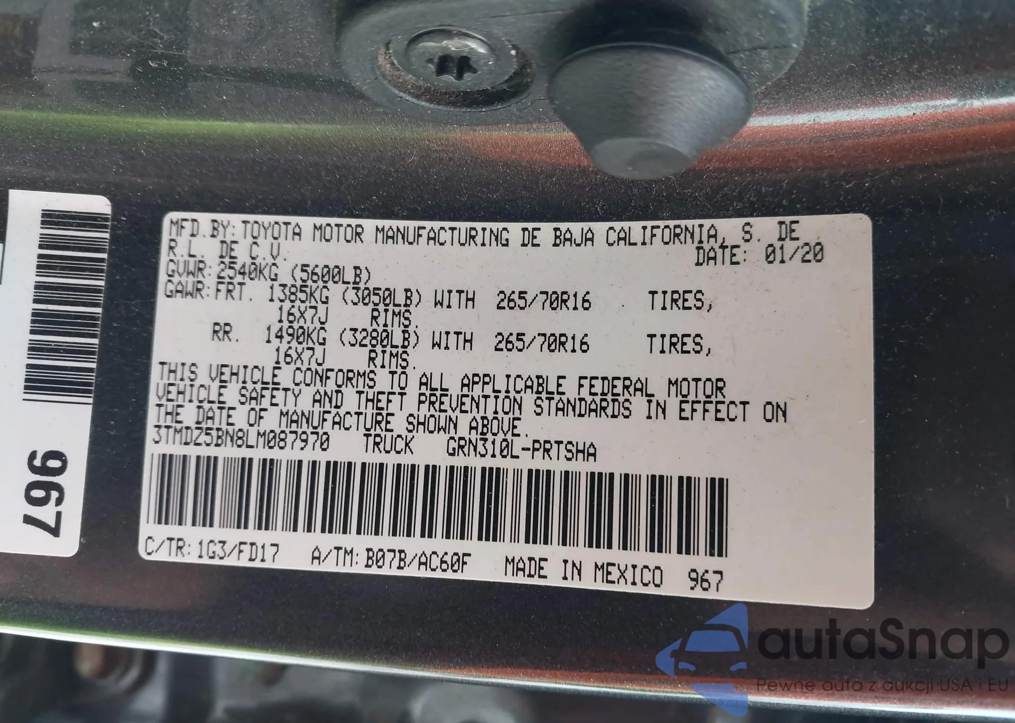Автомобиль Toyota Tacoma 2020 (VIN 3TMDZ5BN8LM087970) ранее не участвовал в торгах. Документы чистые, пробег соответствует или ниже среднего по рынку. Продаётся страховой компанией — рекомендуем покупку. Доставка в порт займет около 6–8 недель.