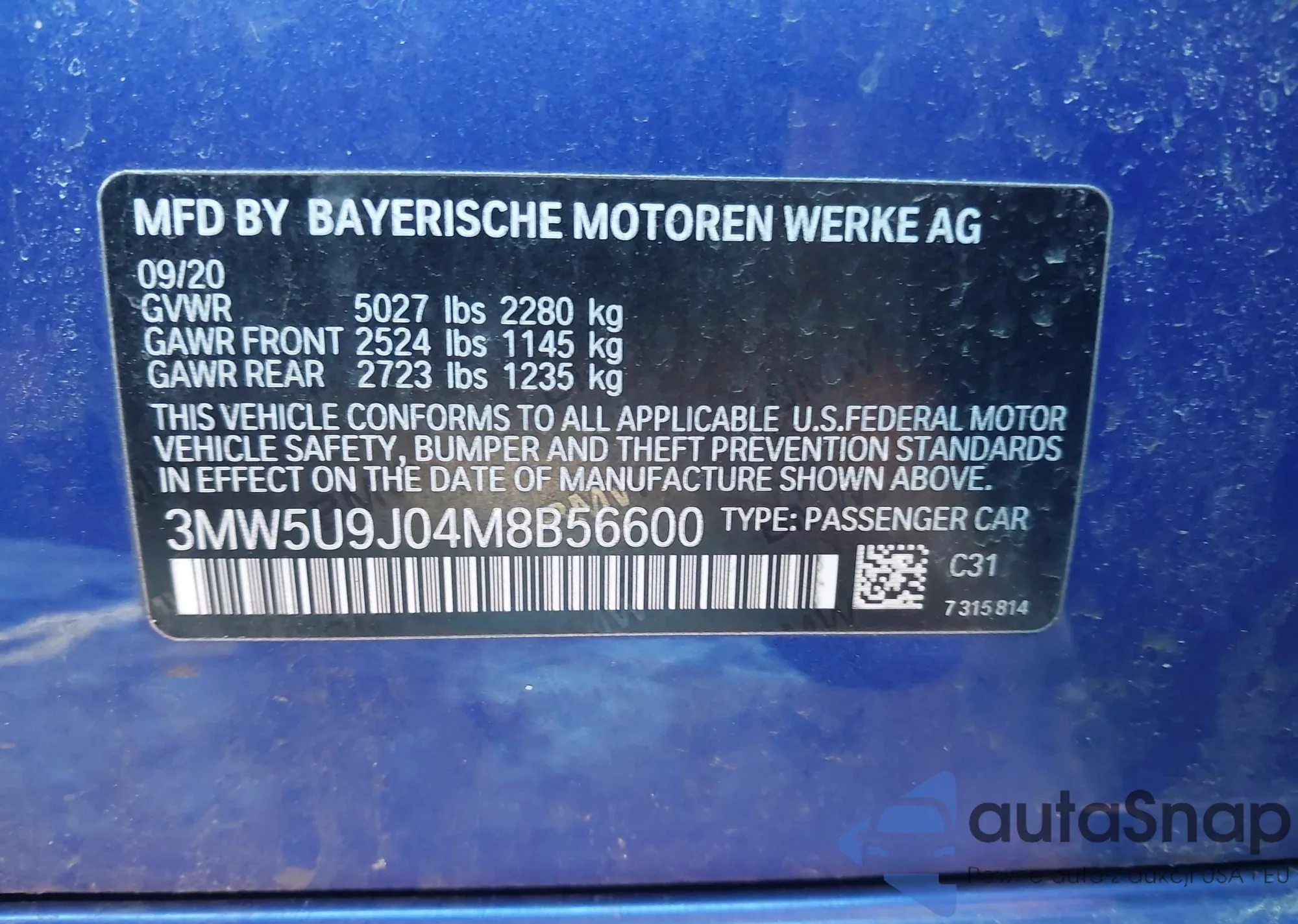 • VIN: 3MW5U9J04M8B56600
