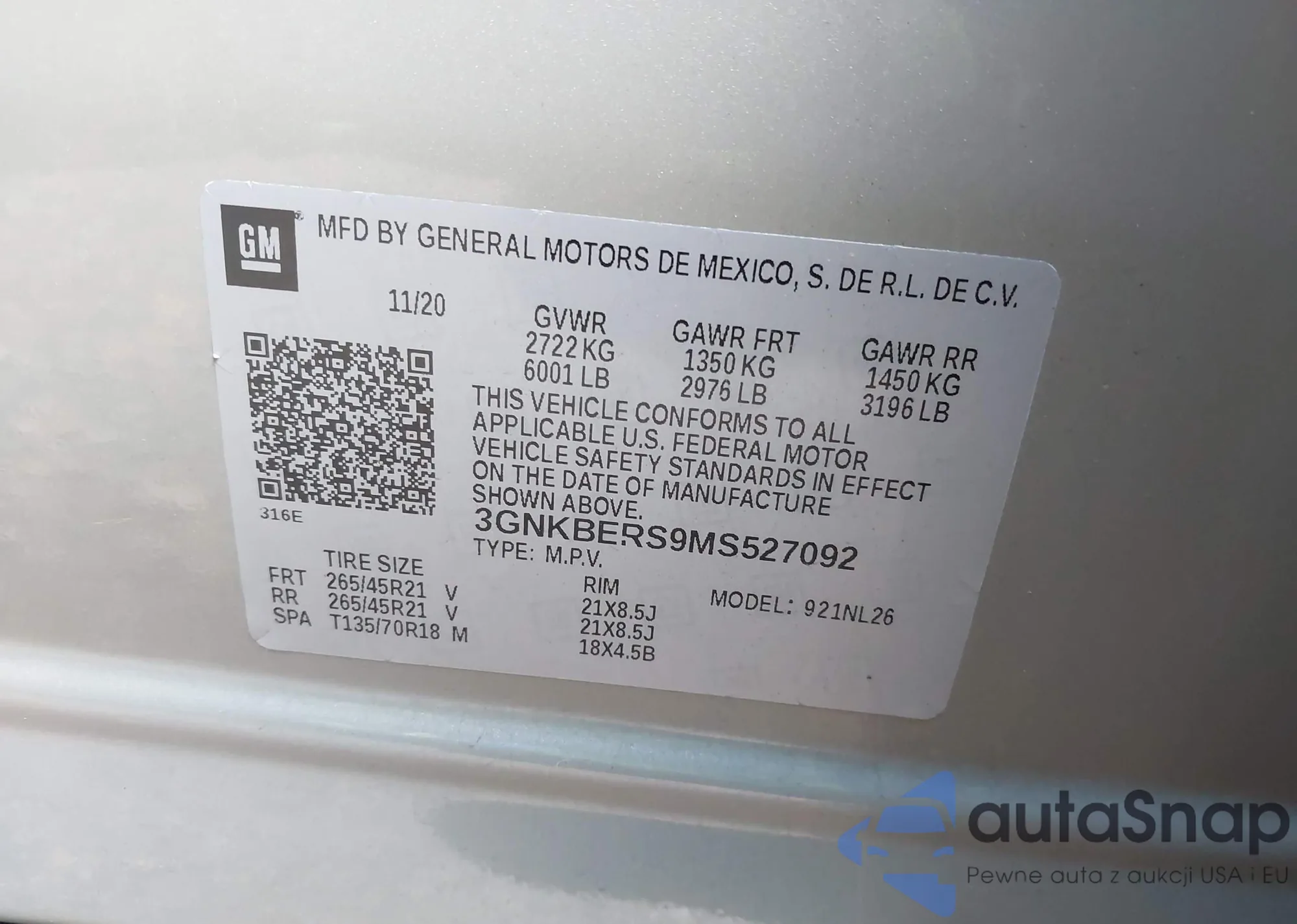 • VIN: 3GNKBERS9MS527092