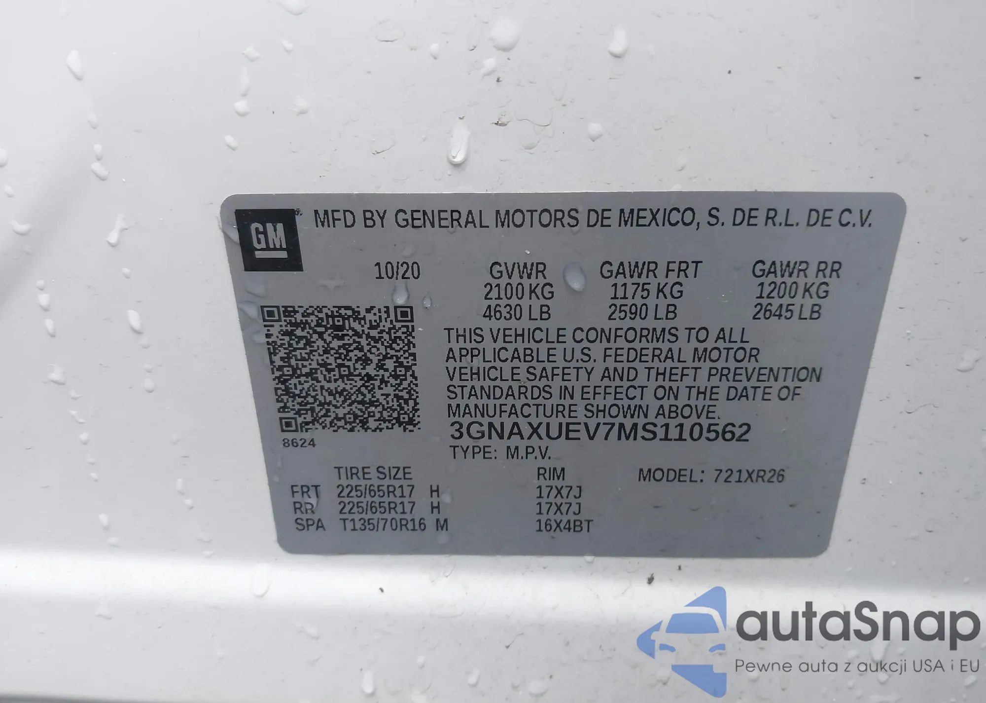 Автомобиль Chevrolet Equinox 2021 (VIN 3GNAXUEV7MS110562) имеет документы, препятствующие регистрации. Могут возникнуть сложности при экспорте и регистрации. Обратитесь к экспертам AutaSnap для поиска альтернатив.