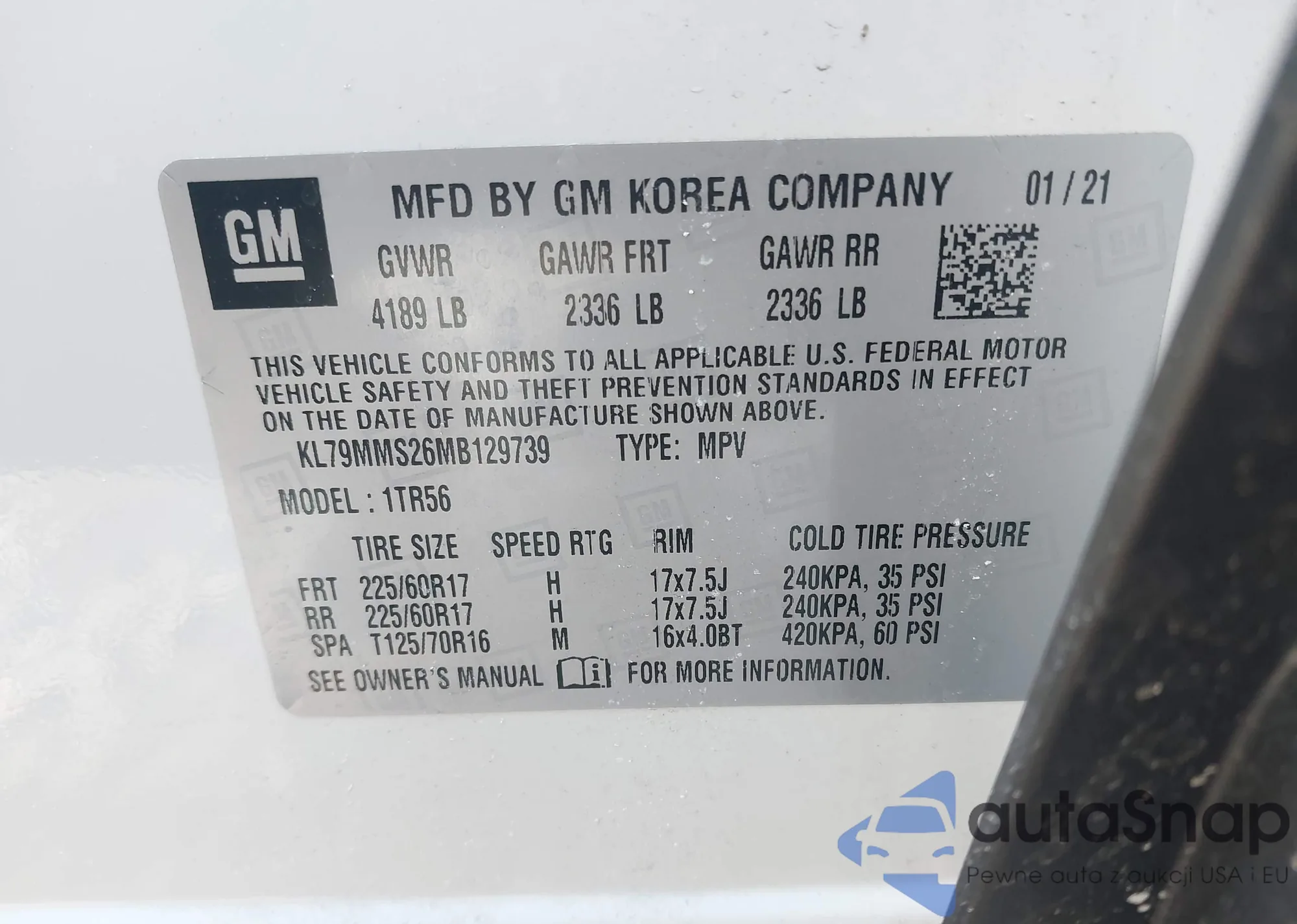 Автомобиль Chevrolet TrailBlazer 2021 (VIN KL79MMS26MB129739) ранее не участвовал в торгах. Документы чистые, пробег соответствует или ниже среднего по рынку. Продаётся страховой компанией — рекомендуем покупку. Доставка в порт займет около 6–8 недель.