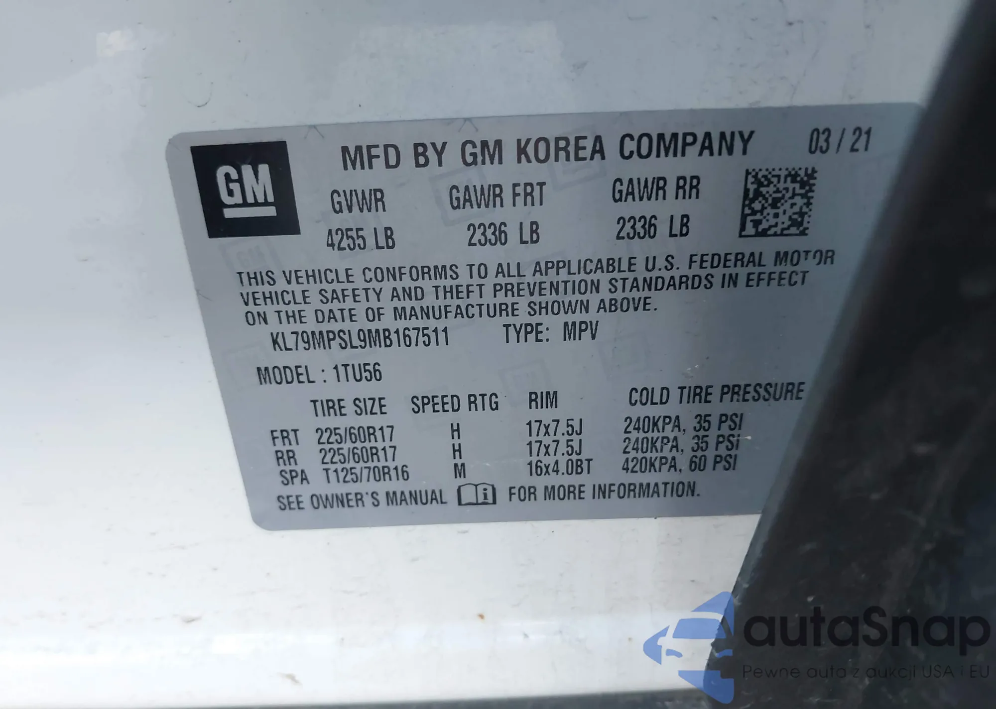 Автомобиль Chevrolet TrailBlazer 2021 (VIN KL79MPSL9MB167511) ранее не участвовал в торгах. Документы чистые, пробег соответствует или ниже среднего по рынку. Продаётся страховой компанией — рекомендуем покупку. Доставка в порт займет около 6–8 недель.