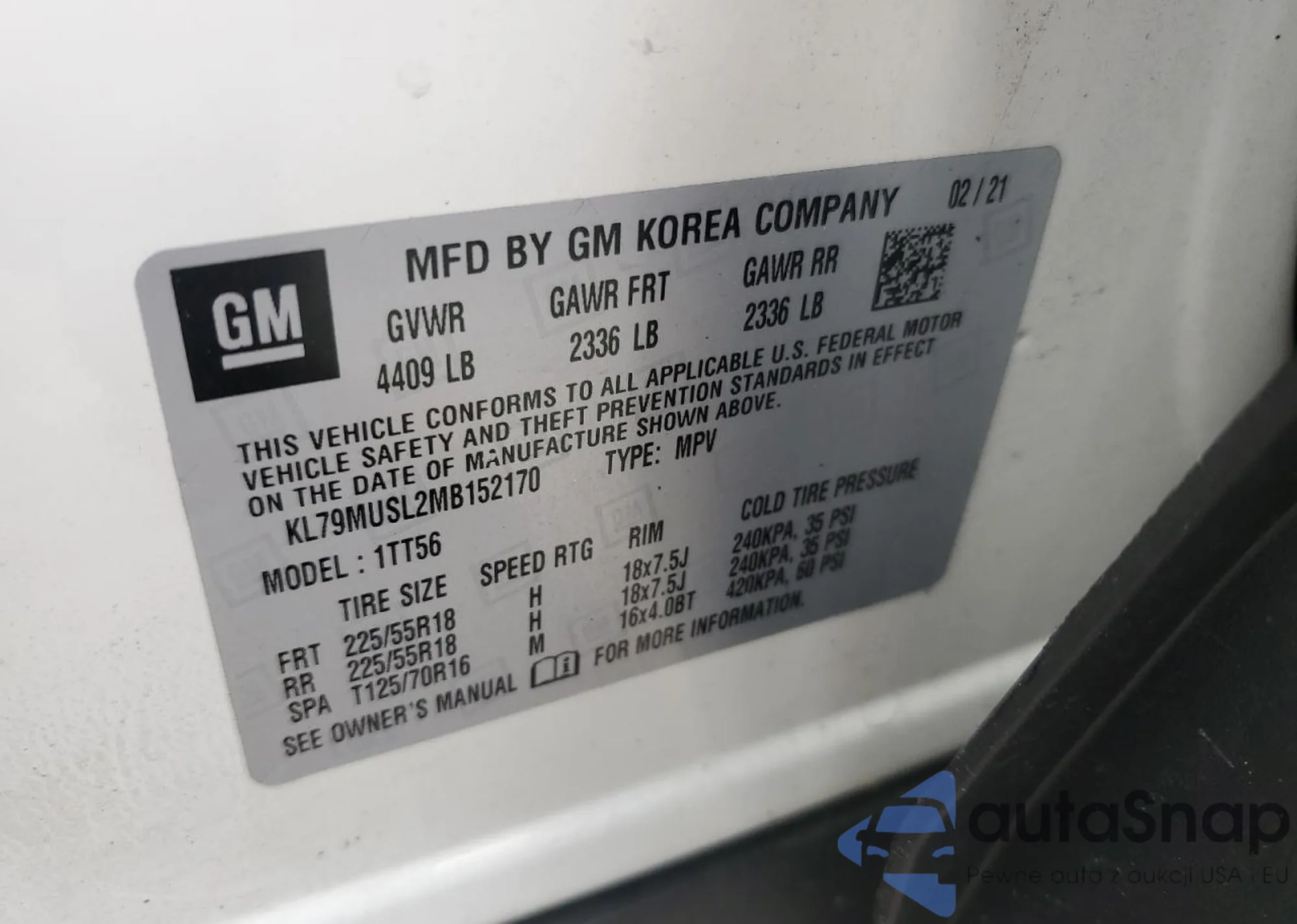 Автомобиль Chevrolet TrailBlazer 2021 (VIN KL79MUSL2MB152170) продаётся непроверенным продавцом. Рекомендуем проверить отчет Carfax и подтвердить возможность регистрации перед покупкой.