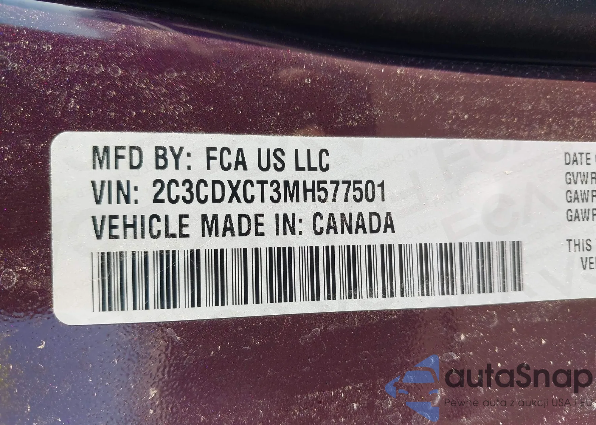 • VIN: 2C3CDXCT3MH577501