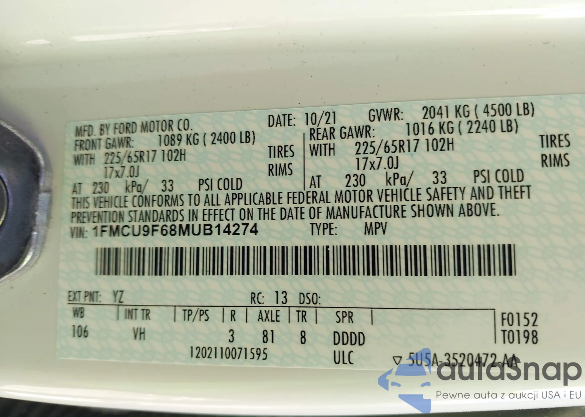 VIN: 1FMCU9F68MUB14274