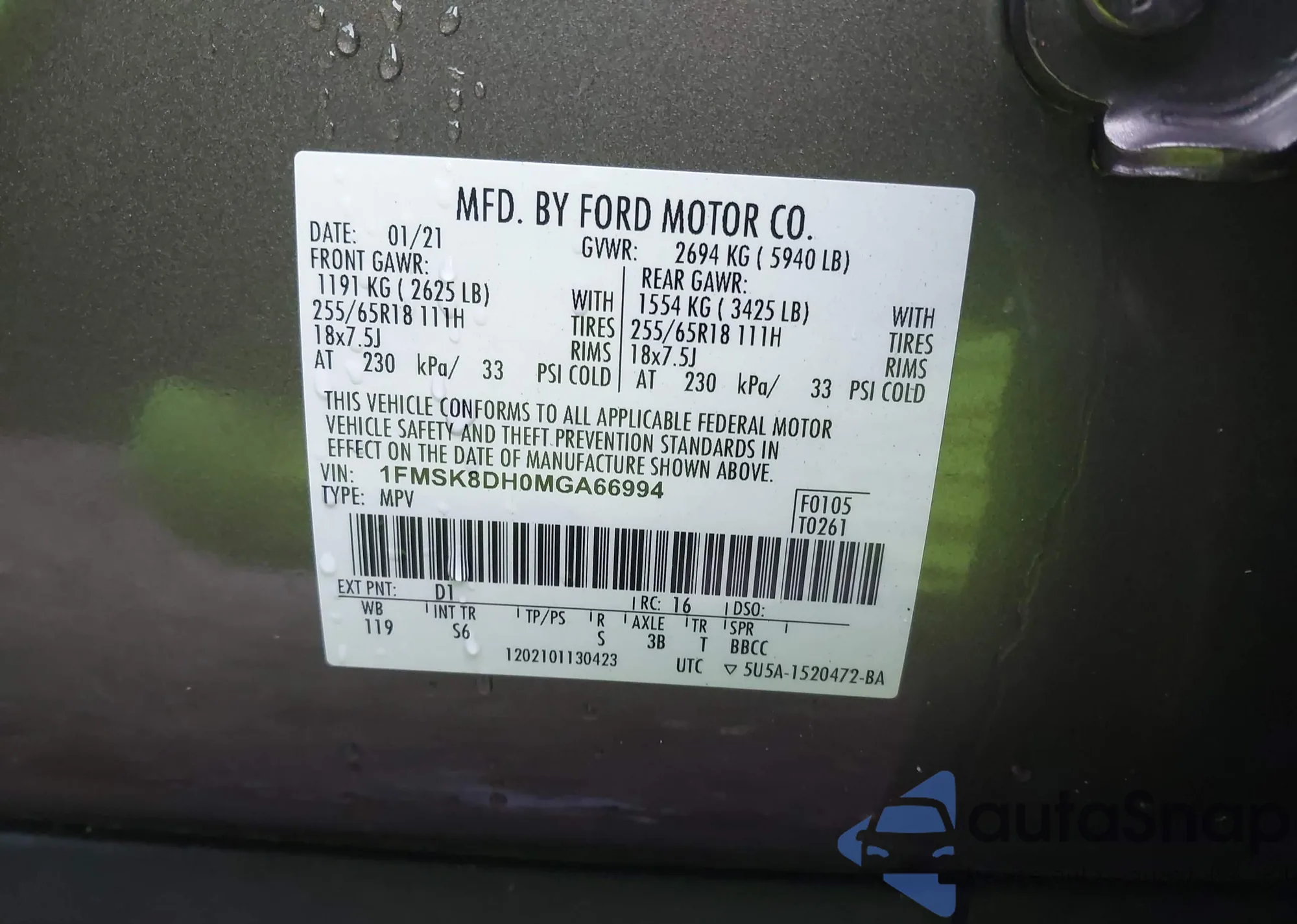 VIN: 1FMSK8DH0M6A66994