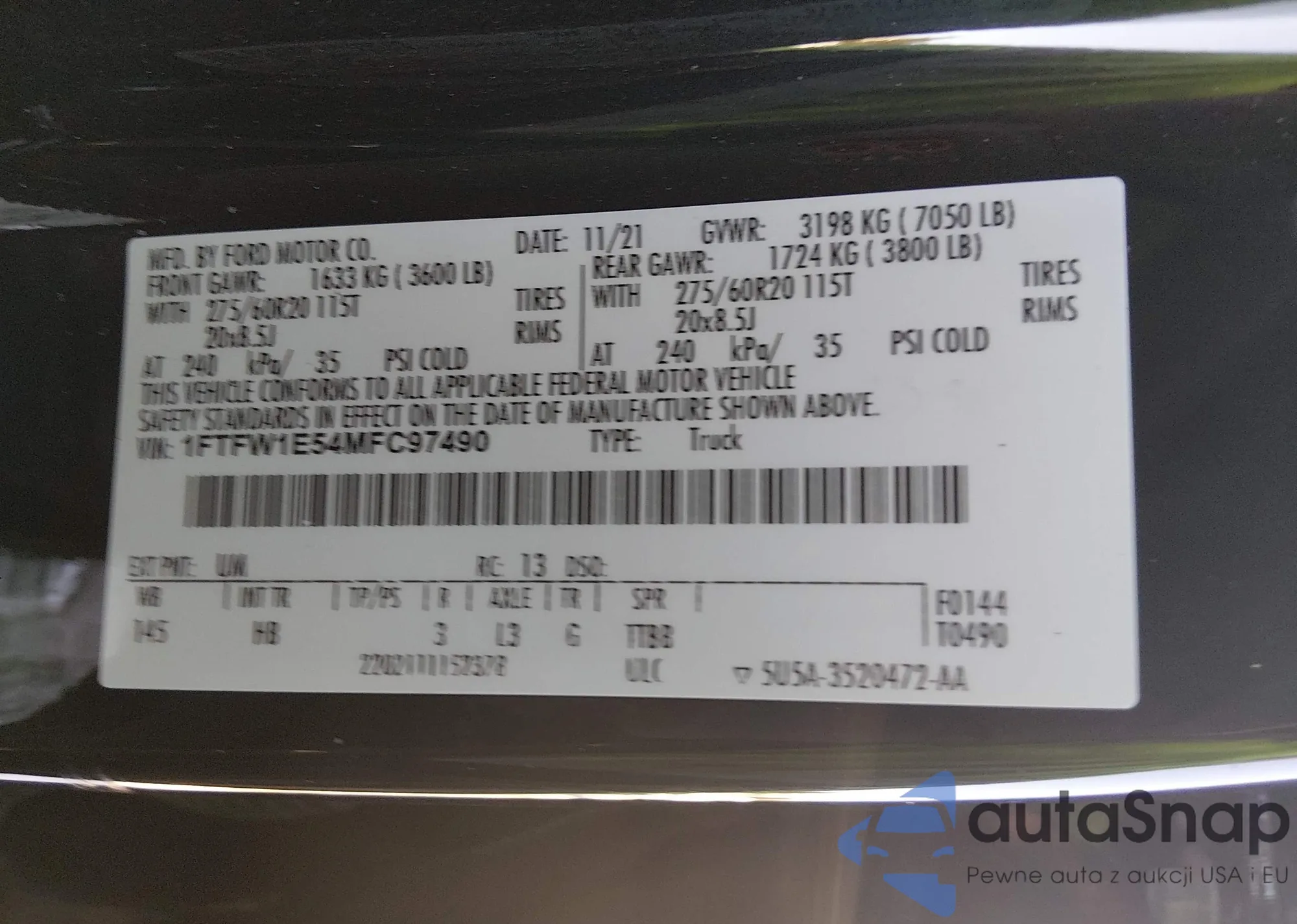 Автомобиль Ford F-150 2021 (VIN 1FTFW1E54MFC97490) ранее не участвовал в торгах. Документы чистые, пробег соответствует или ниже среднего по рынку. Продаётся страховой компанией — рекомендуем покупку. Доставка в порт займет около 6–8 недель.