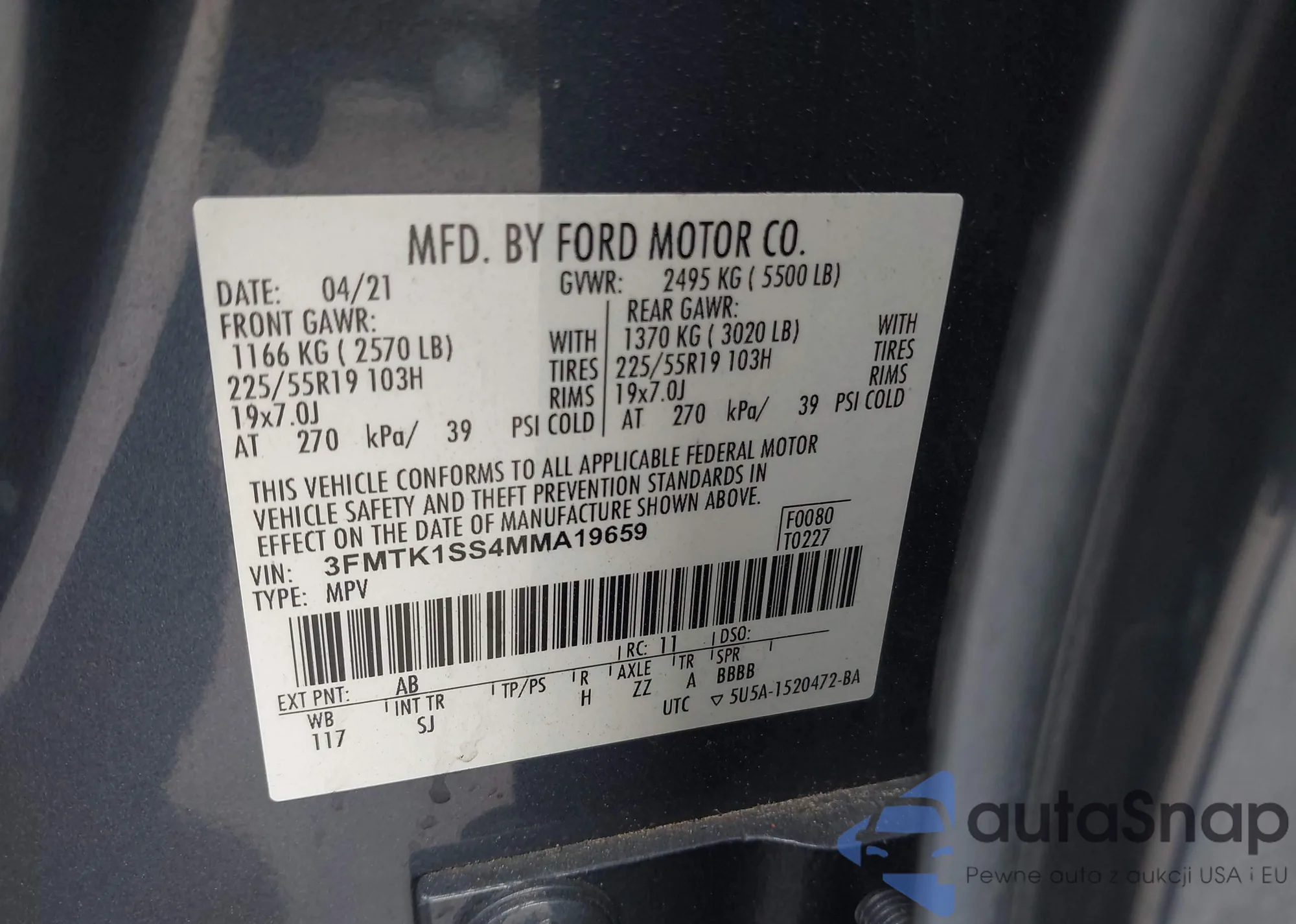 Автомобиль Ford Mustang Mach-E 2021 (VIN 3FMTK1SS4MMA19659) имеет документы, препятствующие регистрации. Могут возникнуть сложности при экспорте и регистрации. Обратитесь к экспертам AutaSnap для поиска альтернатив.