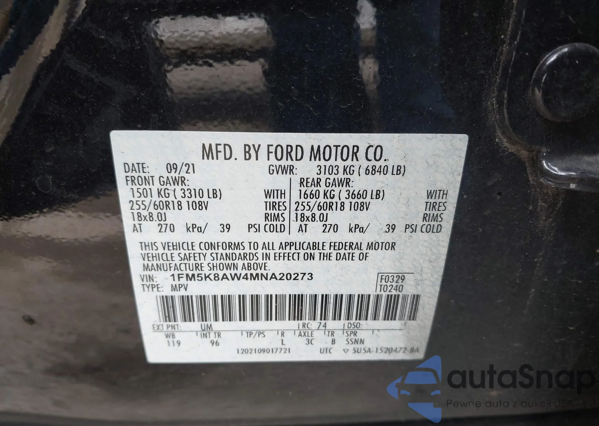 VIN: 1FM5K8AW4MNA20273