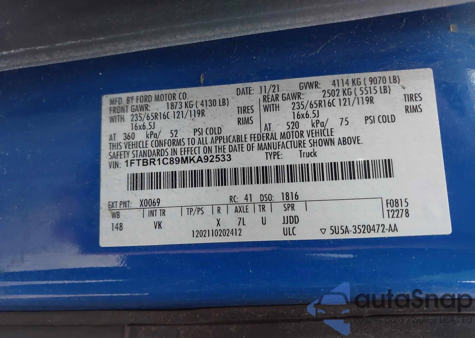 Автомобиль Ford Transit 2021 (VIN 1FTBR1C89MKA92533) продаётся непроверенным продавцом. Рекомендуем проверить отчет Carfax и подтвердить возможность регистрации перед покупкой.