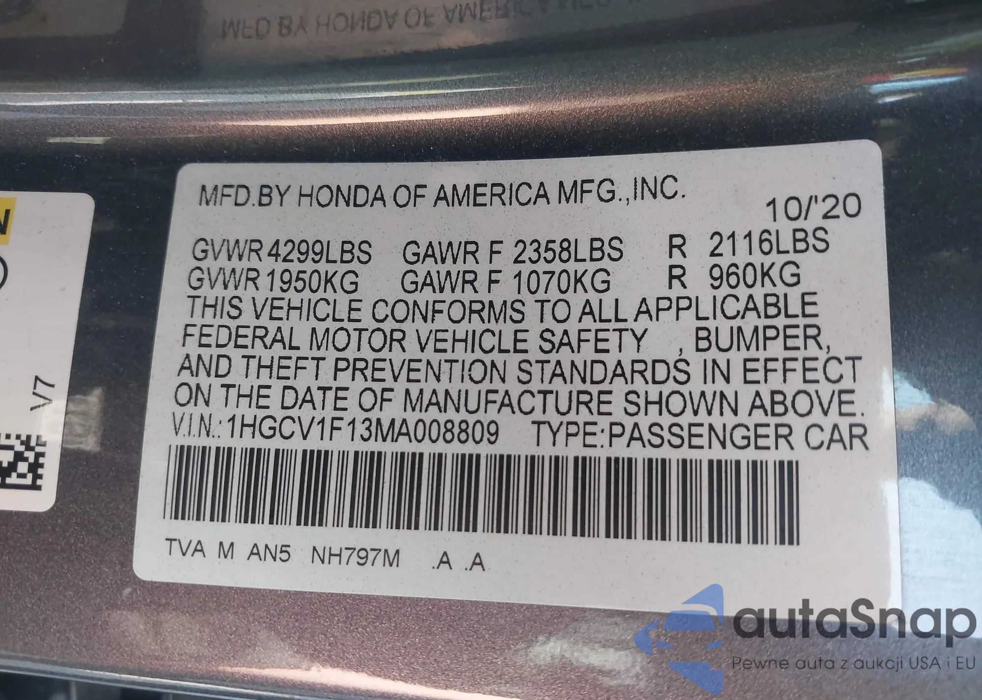 Автомобиль Honda Accord 2021 (VIN 1HGCV1F13MA008809) ранее не участвовал в торгах. Документы чистые, пробег соответствует или ниже среднего по рынку. Продаётся страховой компанией — рекомендуем покупку. Доставка в порт займет около 6–8 недель.