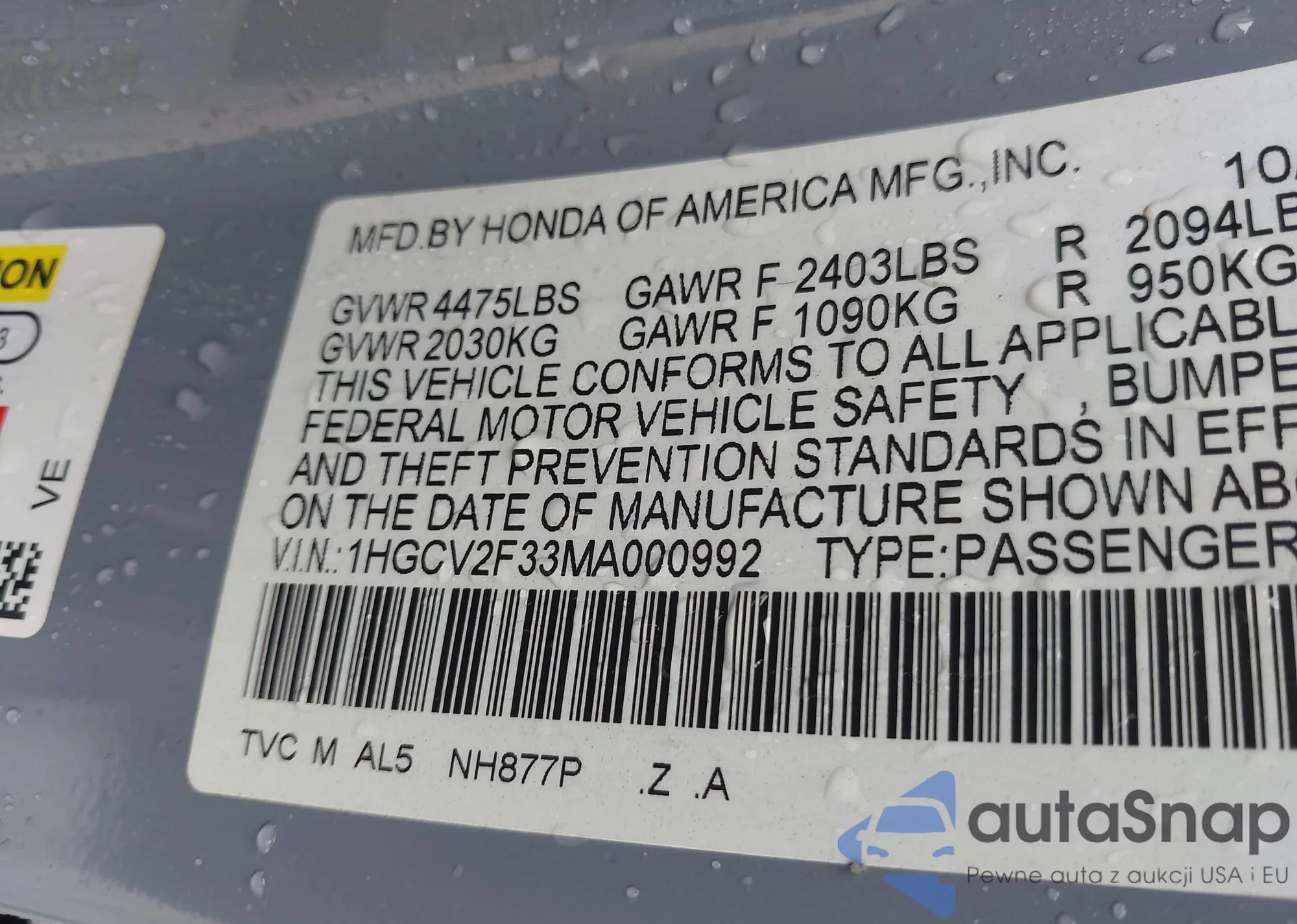 VIN: 1HGCV2F33MA000992