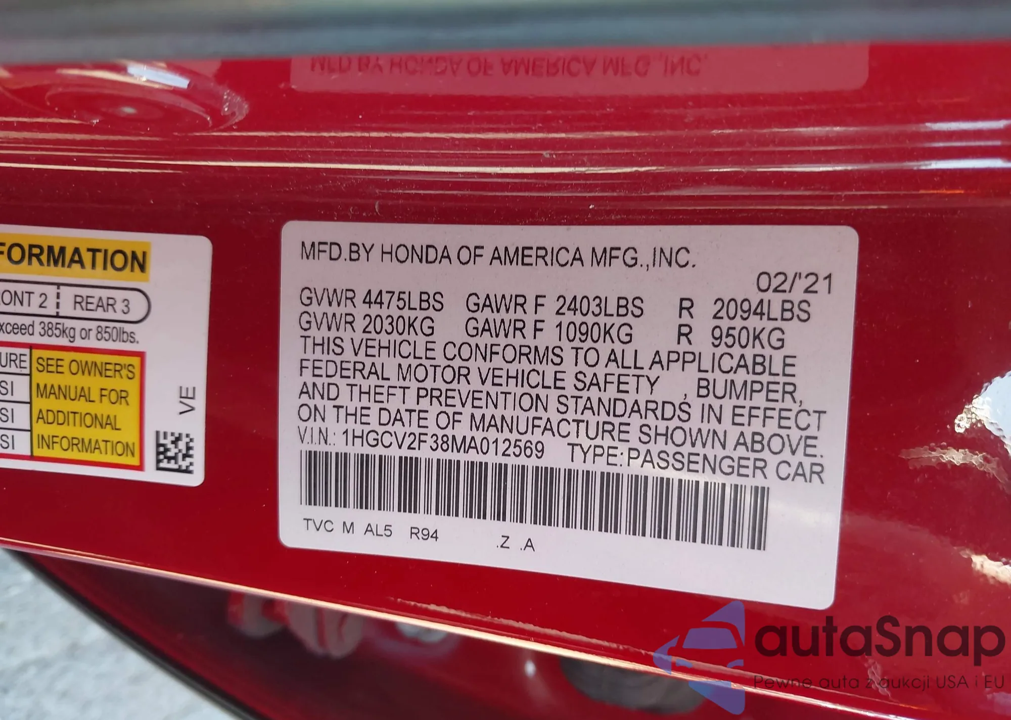 • VIN: 1HGCV2F38MA012569