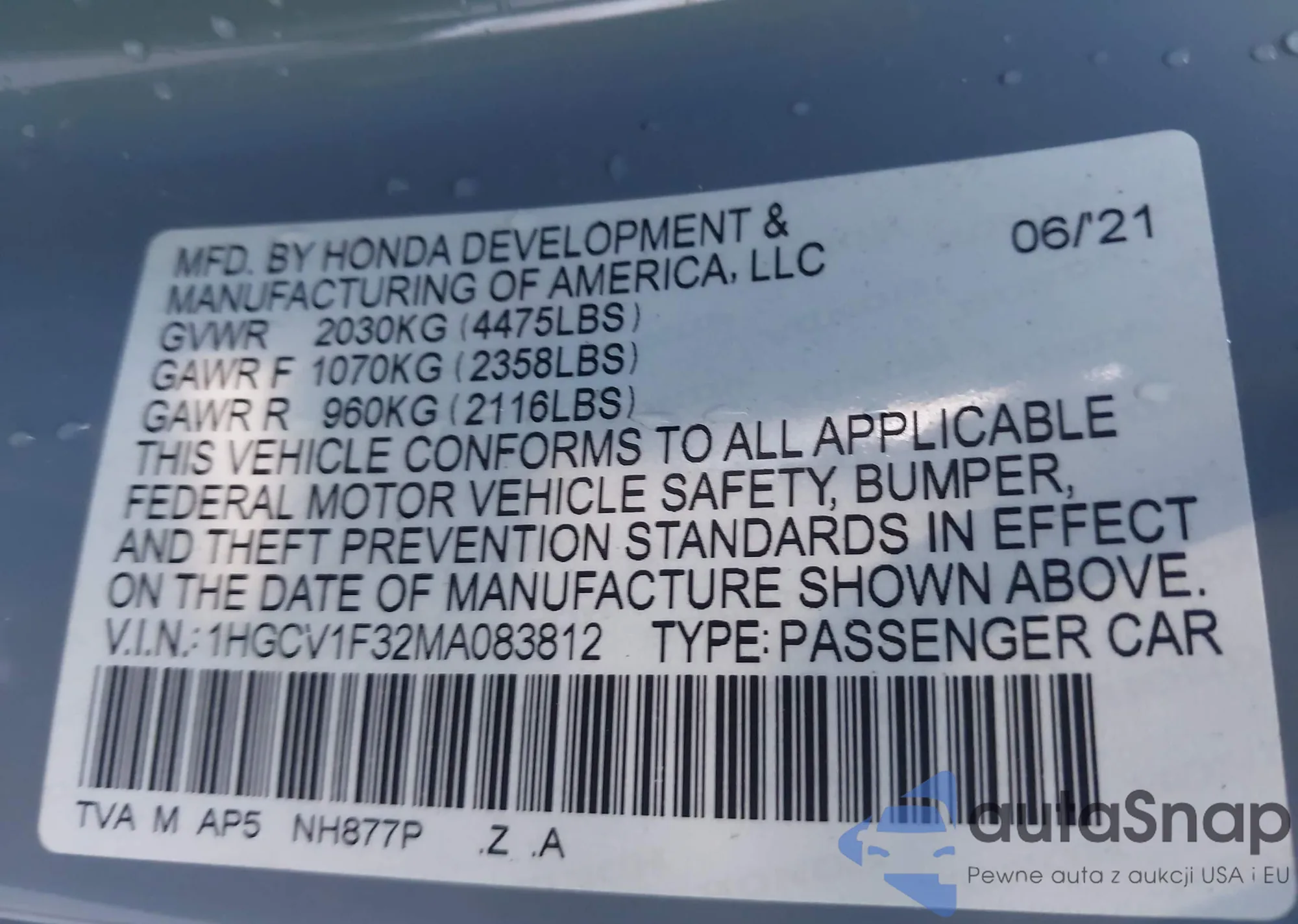 • VIN: 1HGCV1F32MA083812