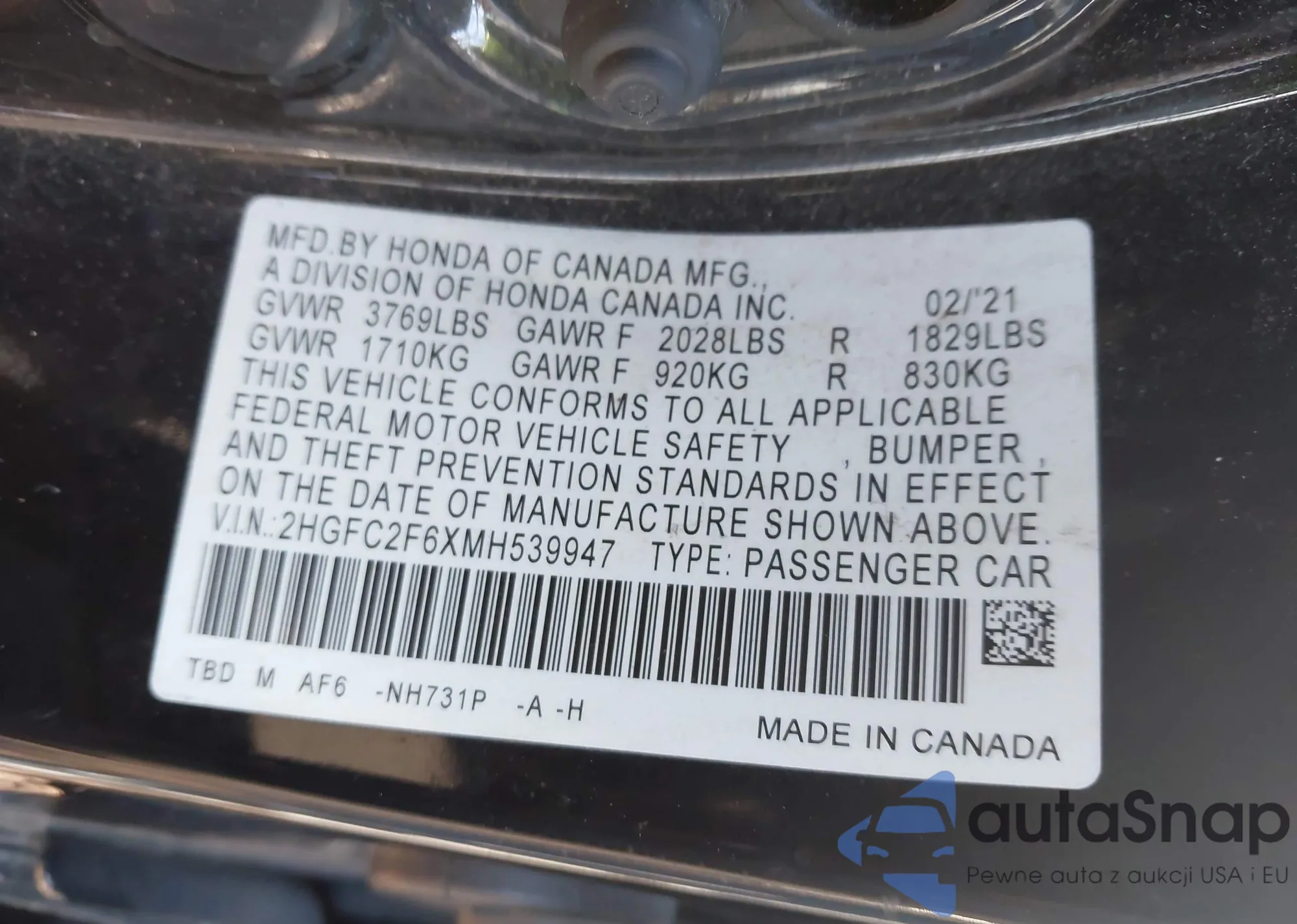 Автомобиль Honda Civic 2021 (VIN 2HGFC2F6XMH539947) ранее не участвовал в торгах. Документы чистые, пробег соответствует или ниже среднего по рынку. Продаётся страховой компанией — рекомендуем покупку. Доставка в порт займет около 6–8 недель.