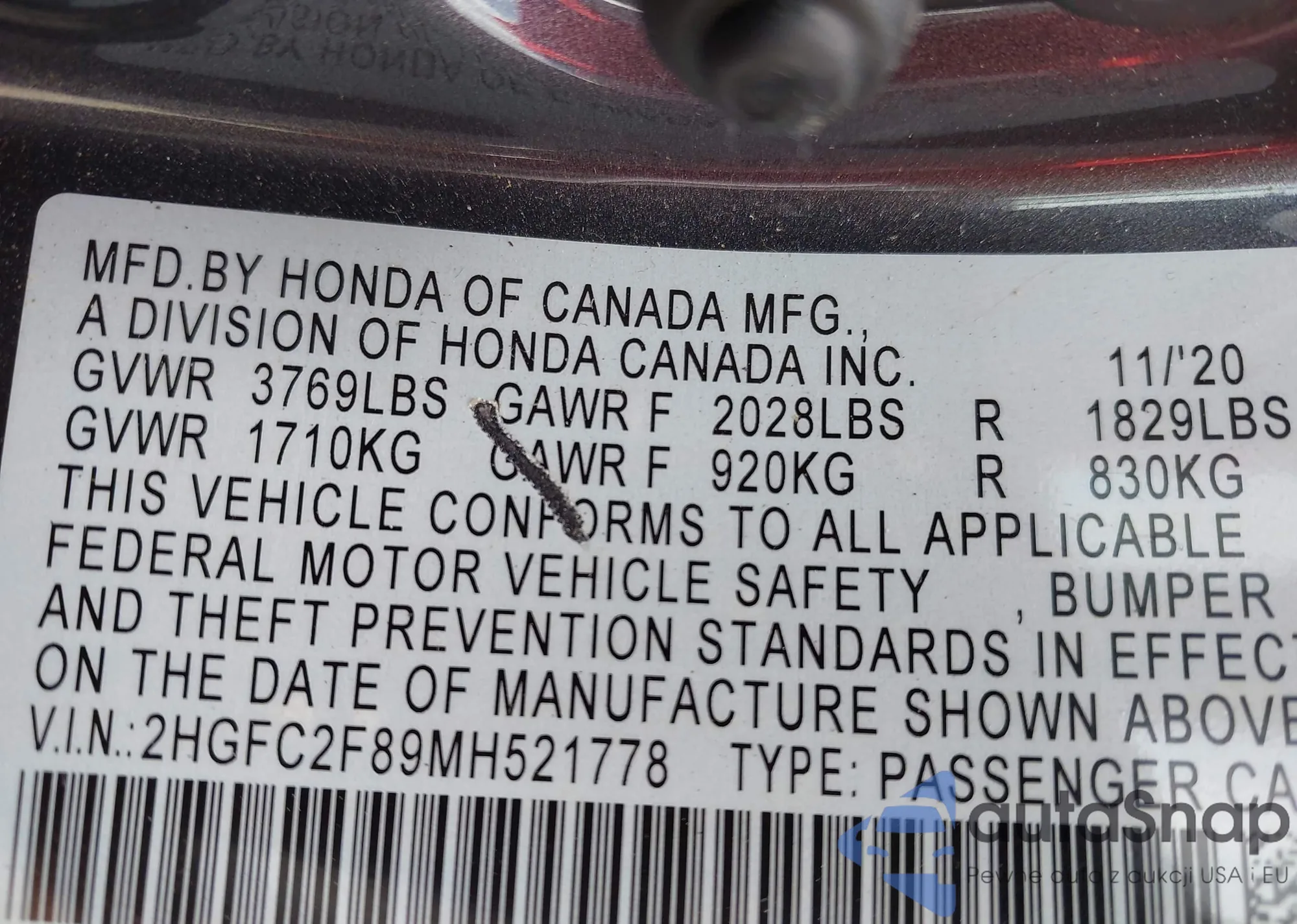 VIN: 2HGFC2F89MH521778
