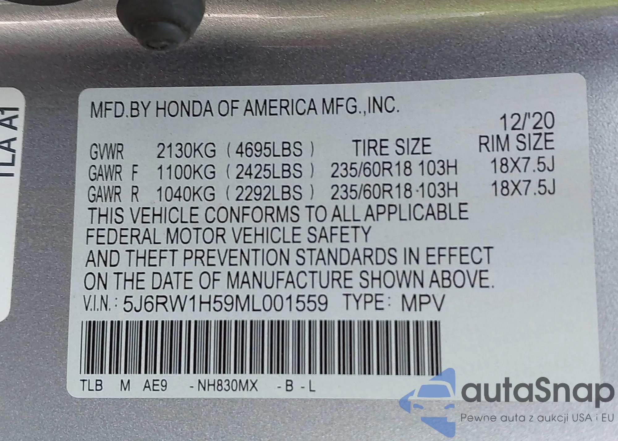 VIN: 5J6RW1H59ML001559