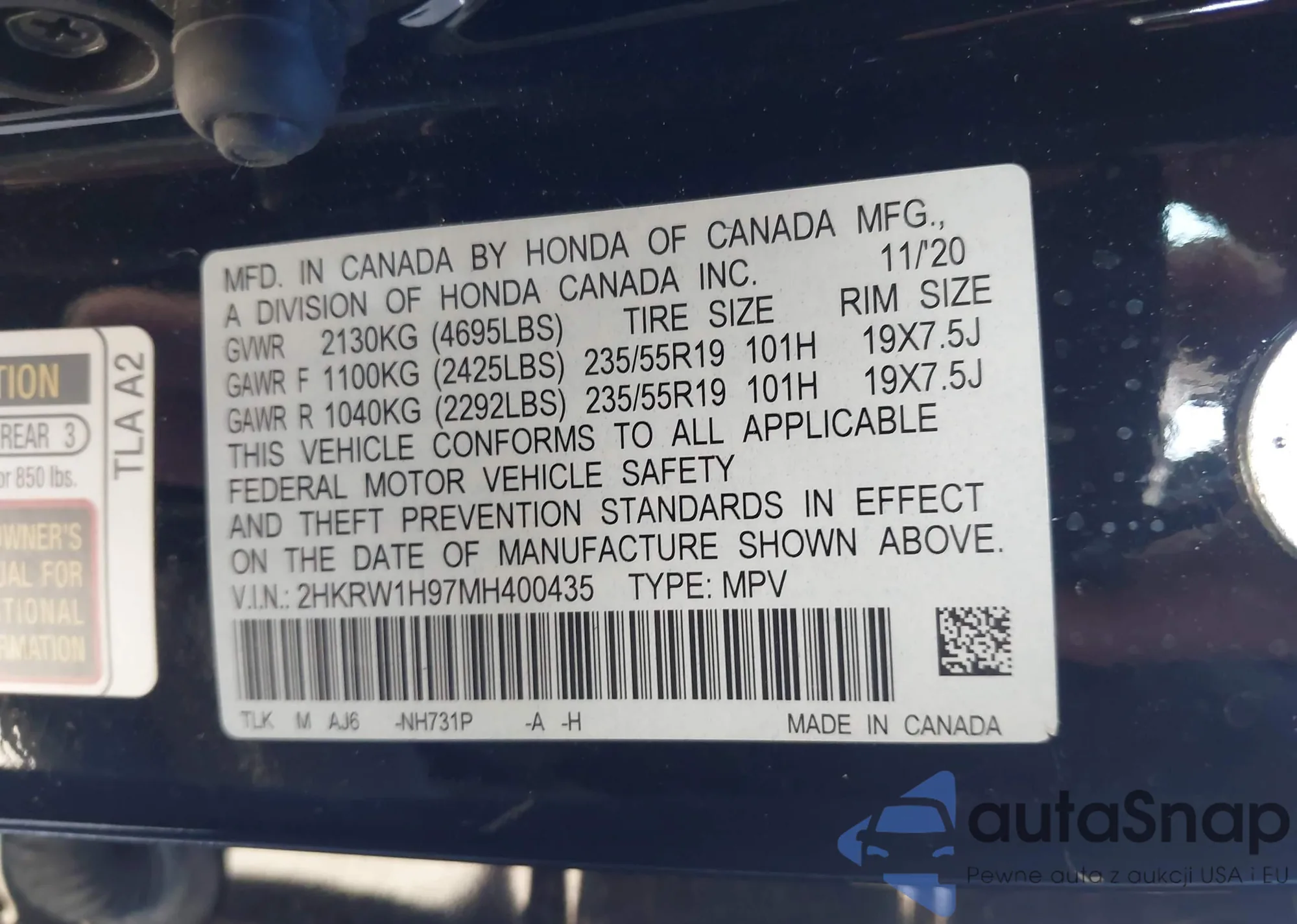 Автомобиль Honda CR-V 2021 (VIN 2HKRW1H97MH400435) ранее не участвовал в торгах. Документы чистые, пробег соответствует или ниже среднего по рынку. Продаётся страховой компанией — рекомендуем покупку. Доставка в порт займет около 6–8 недель.