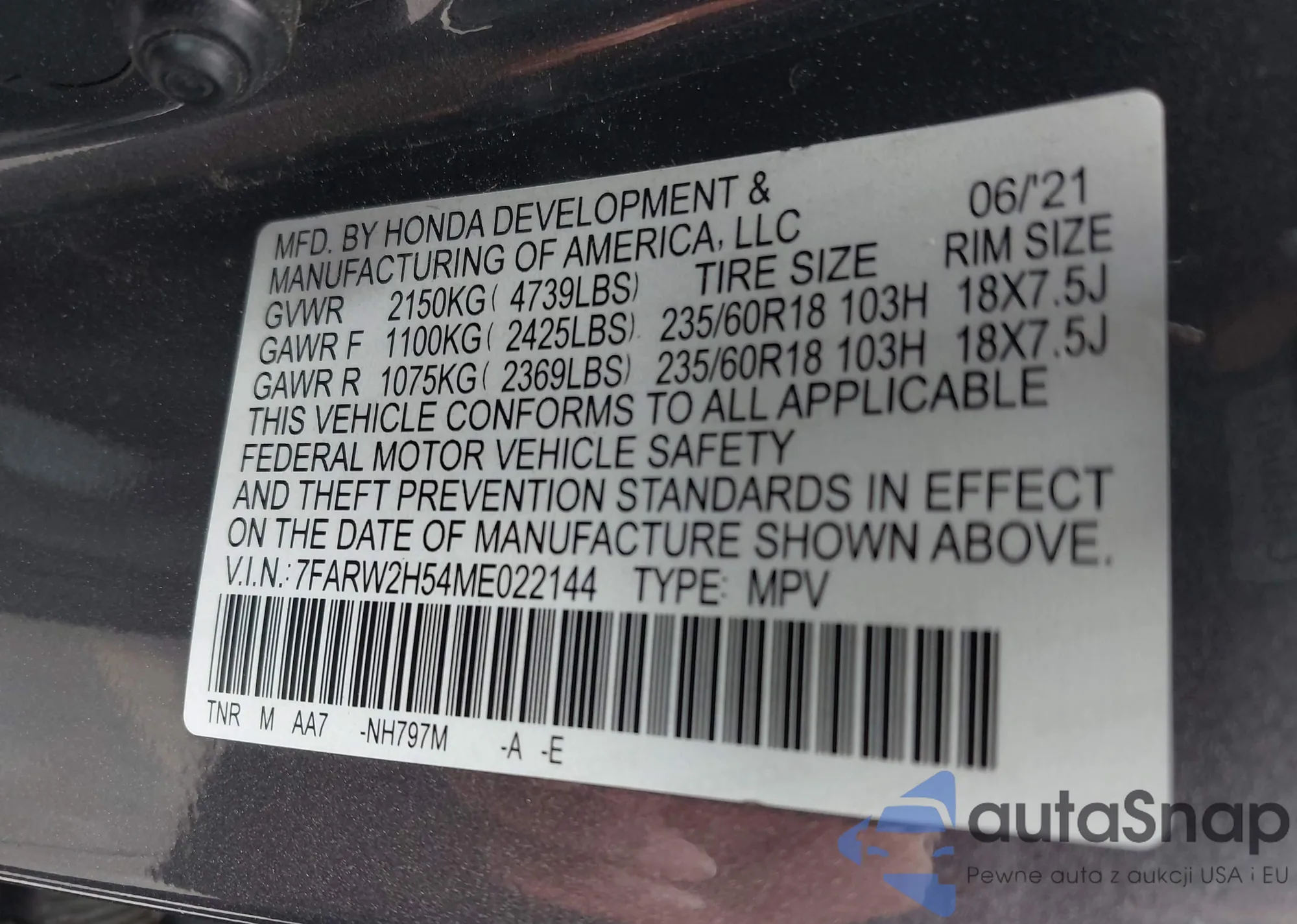• VIN: 7FARW2H54ME022144