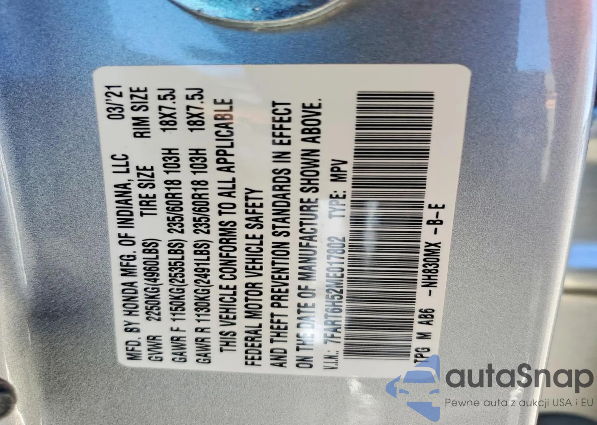 Автомобиль Honda CR-V 2021 (VIN 7FART6H52ME017802) продаётся непроверенным продавцом. Рекомендуем проверить отчет Carfax и подтвердить возможность регистрации перед покупкой.