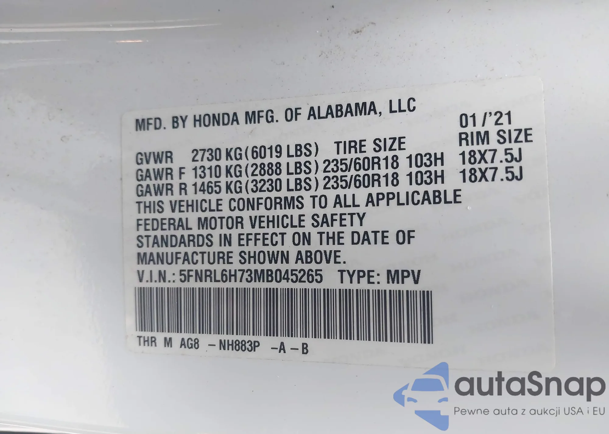VIN: 5FNRL6H73MB045265
