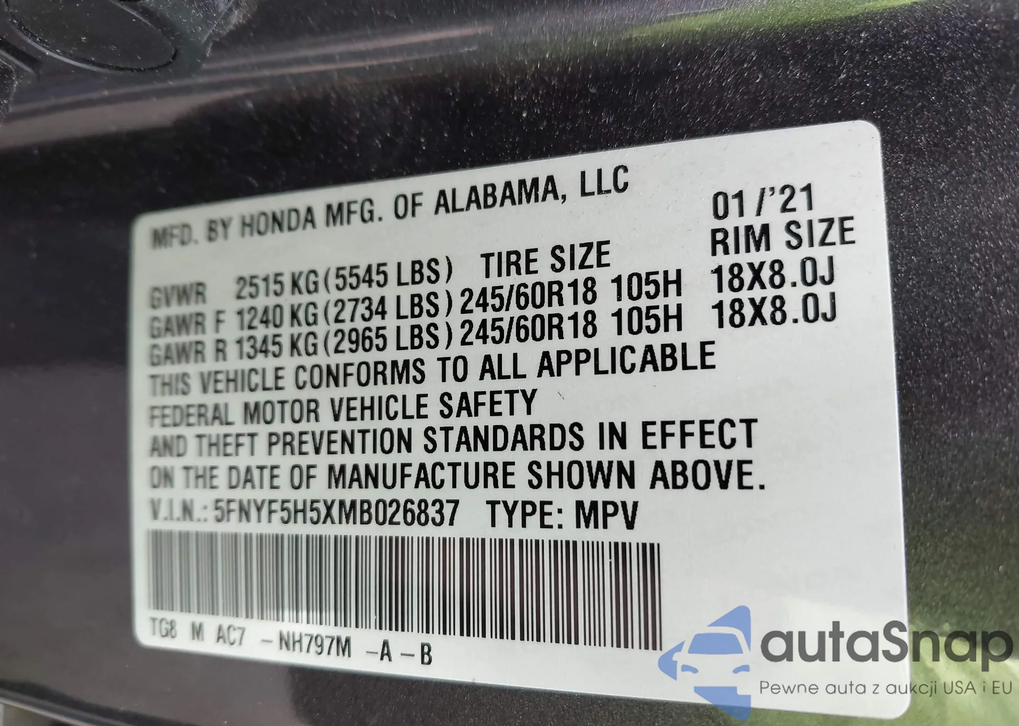 VIN: 5FNYF5H5XMB026837