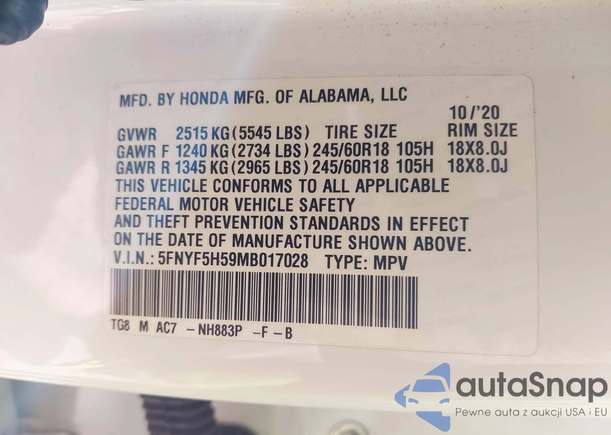 VIN: 5FNYF5H59MB017028