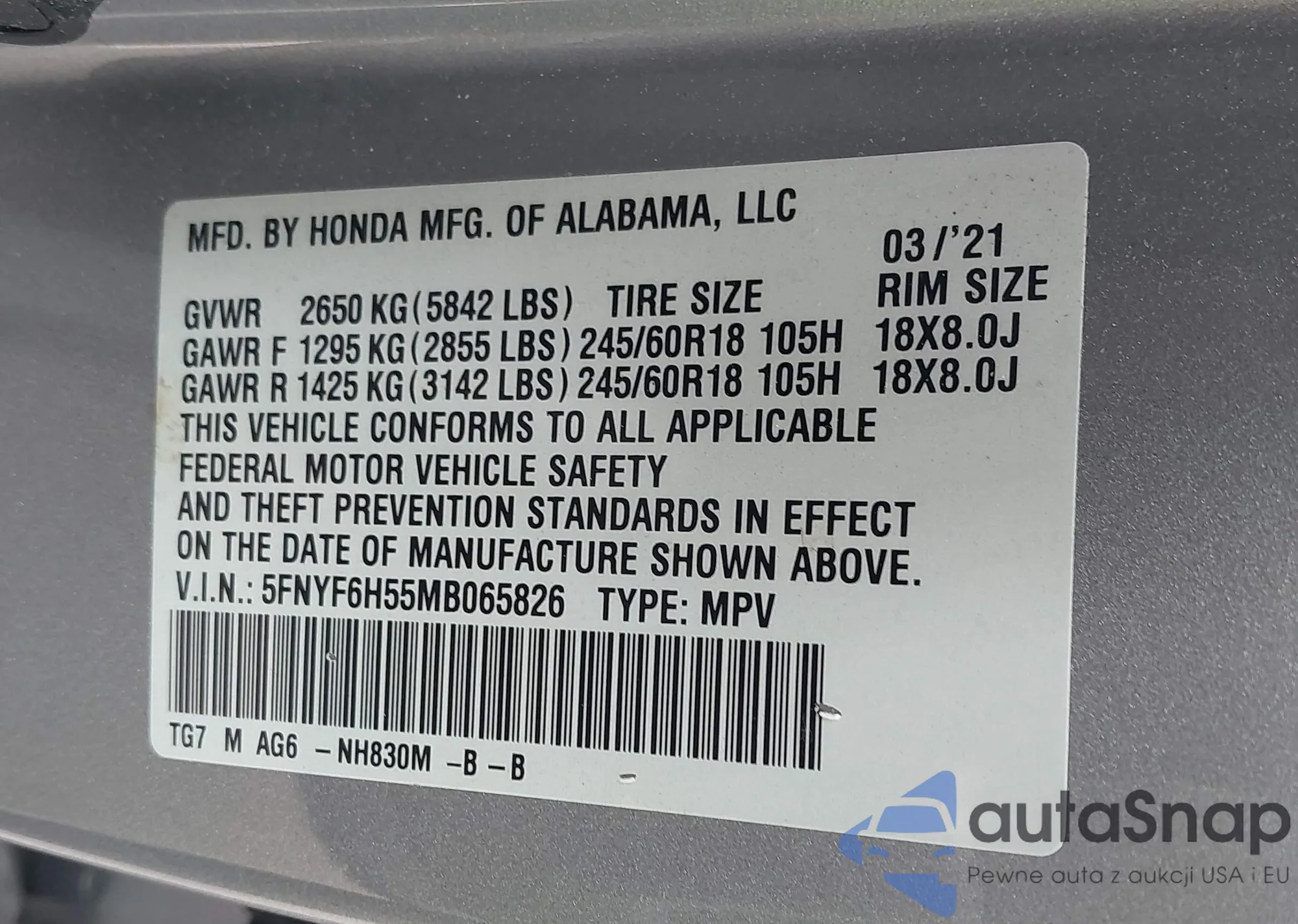 VIN: 5FNYF6H55MB065826