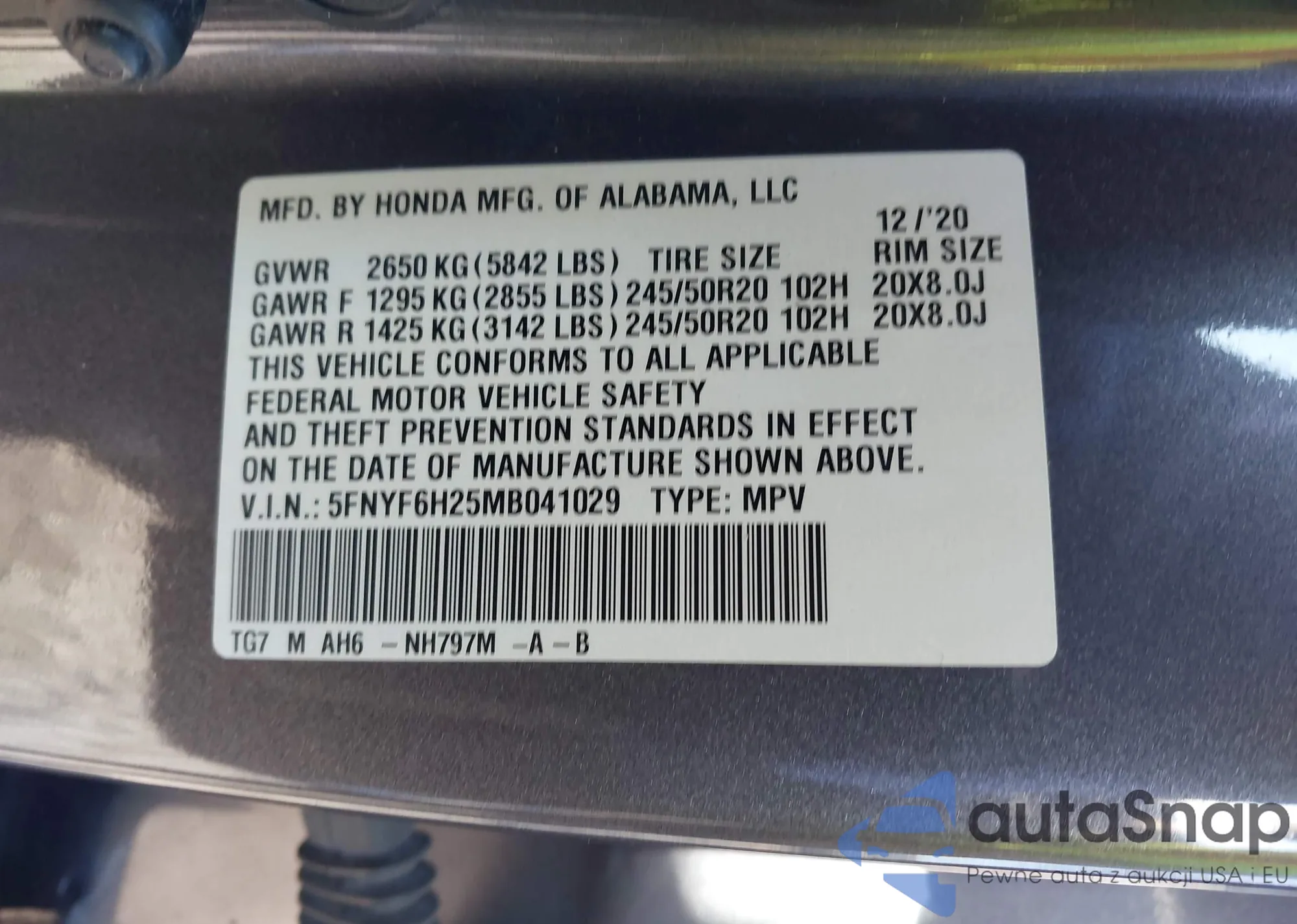 VIN: 5FNYF6H25MB041029
