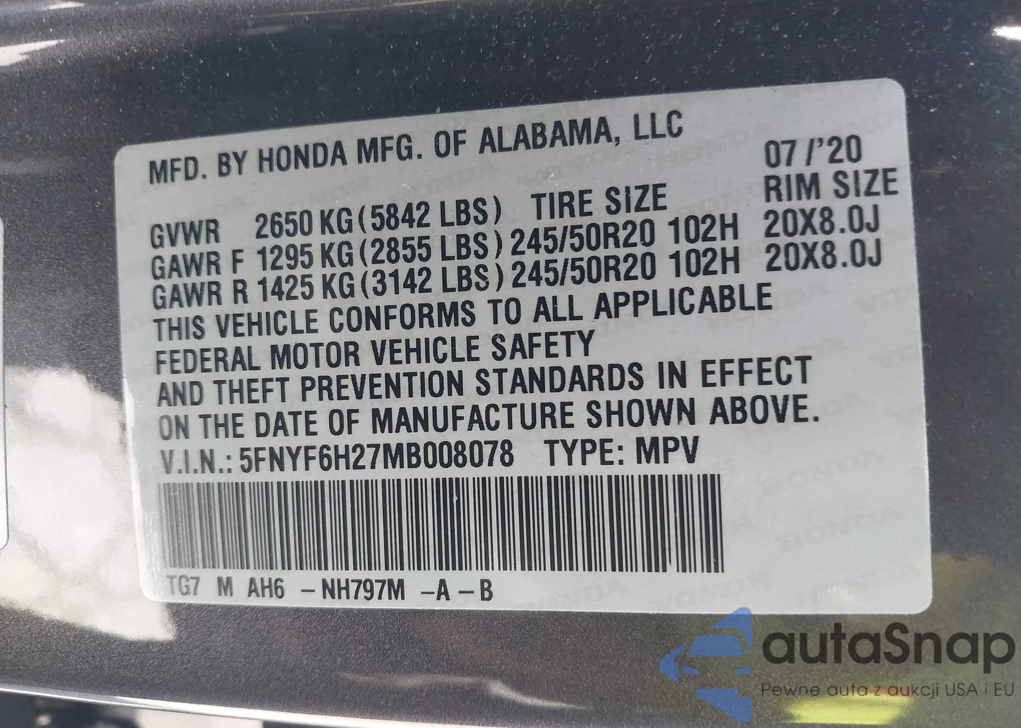 VIN: 5FNYF6H27MB008078