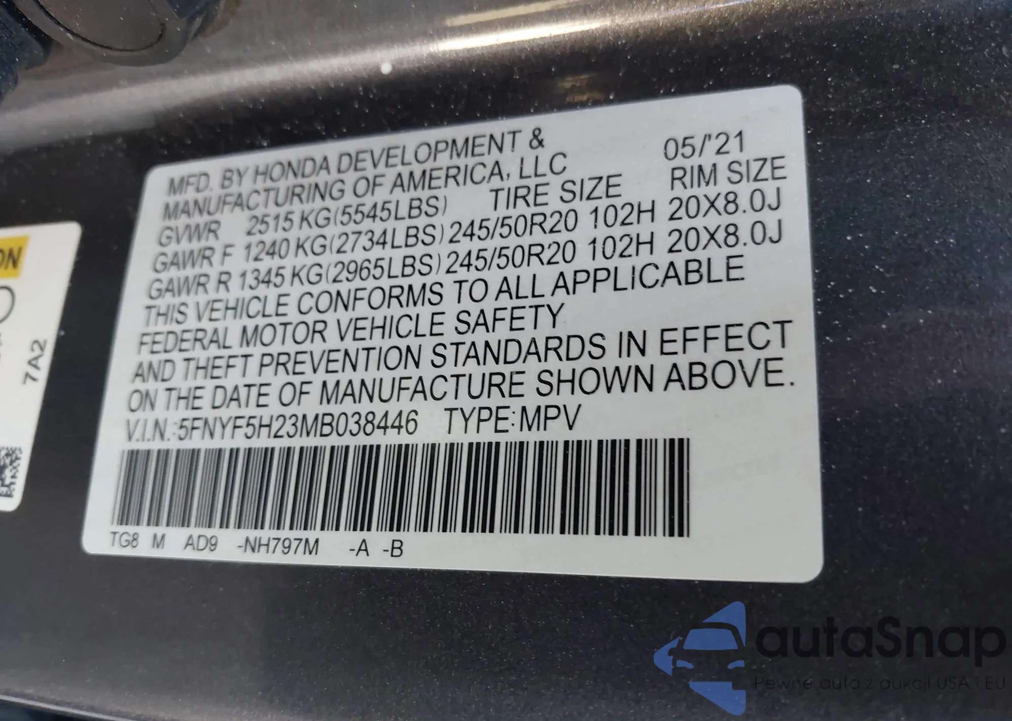 VIN: 5FNYF5H23MB038446