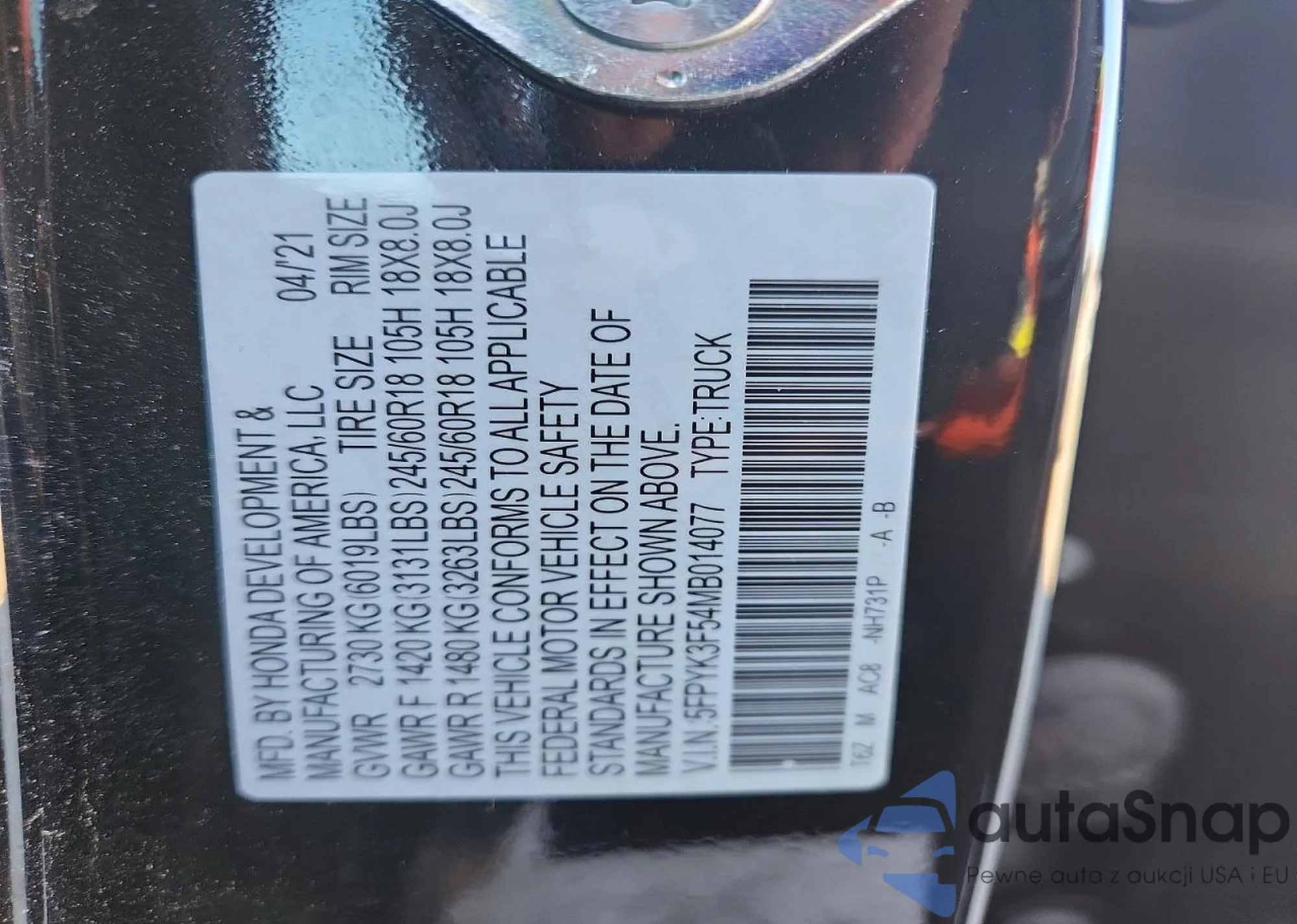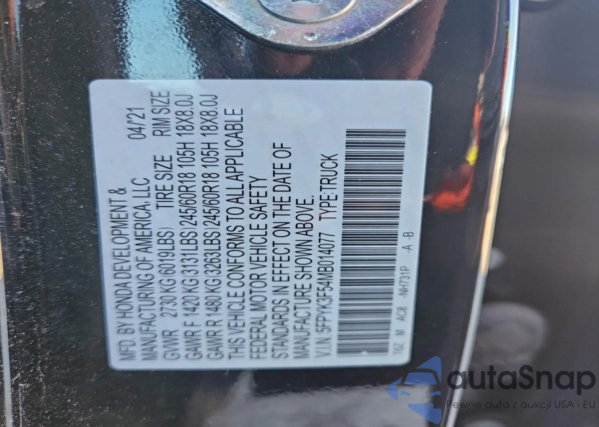 VIN: 5FPYK3F54MB014077