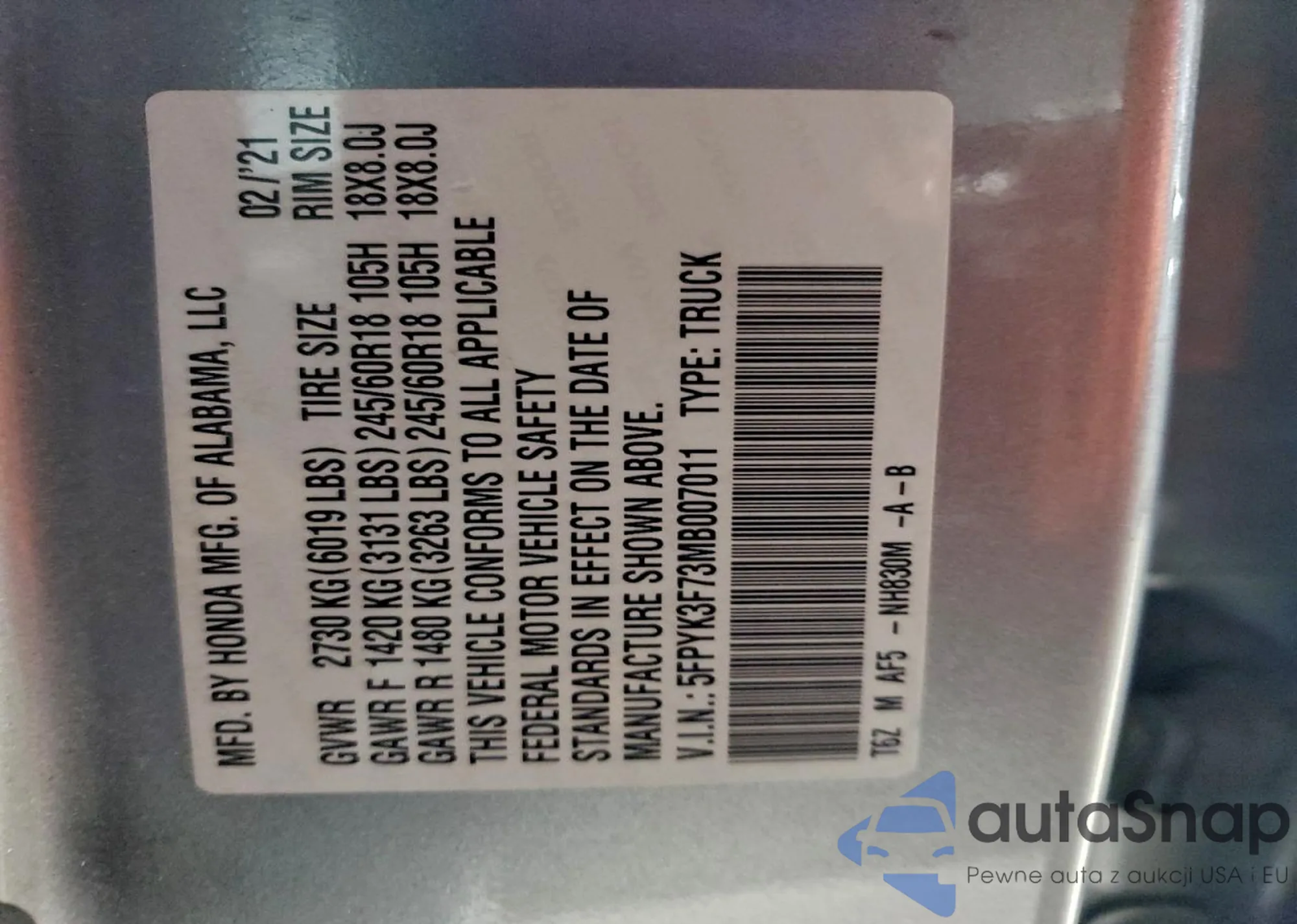 VIN: 5FPYK3F73MB007011