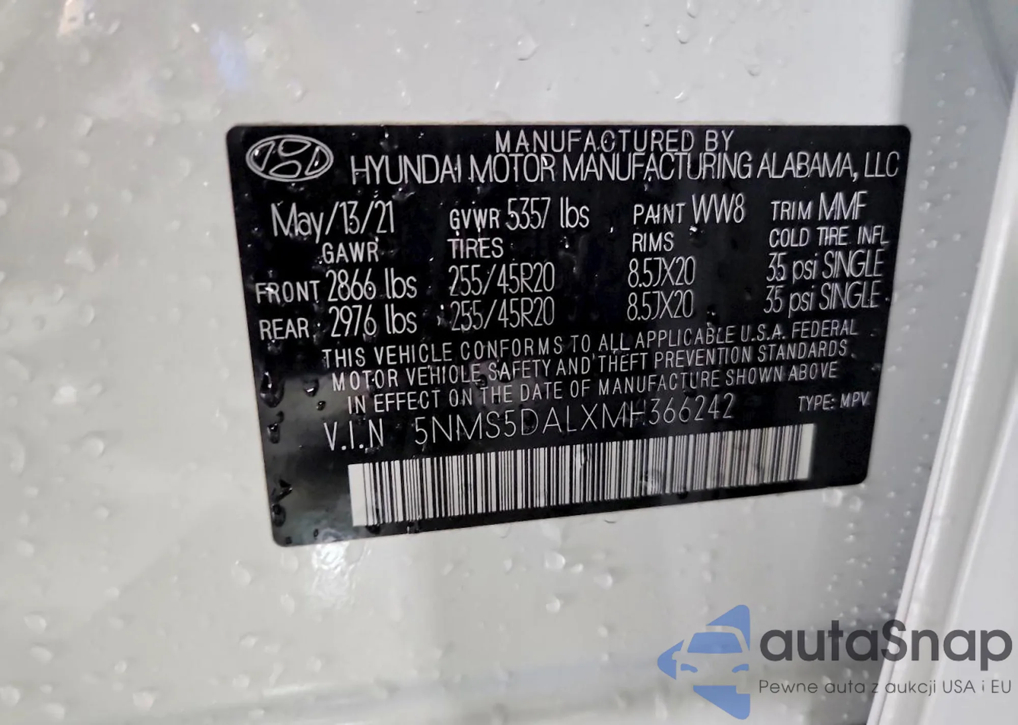 Автомобиль Hyundai Santa Fe 2021 (VIN 5NMS5DALXMH366242) ранее не участвовал в торгах. Документы чистые, пробег соответствует или ниже среднего по рынку. Продаётся страховой компанией — рекомендуем покупку. Доставка в порт займет около 6–8 недель.