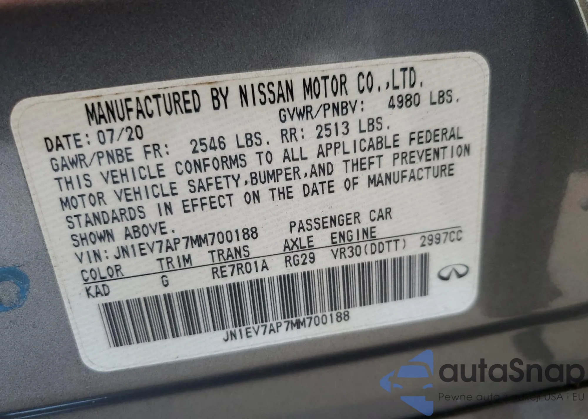 Автомобиль Infiniti Q50 2021 (VIN JN1EV7AP7MM700188) имеет документы, препятствующие регистрации. Могут возникнуть сложности при экспорте и регистрации. Обратитесь к экспертам AutaSnap для поиска альтернатив.