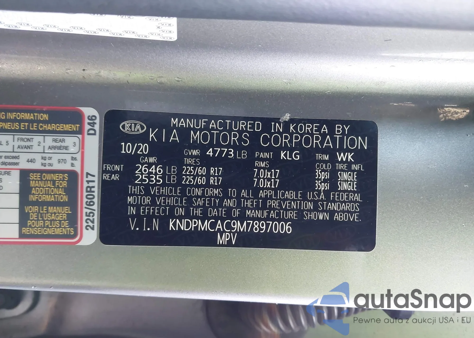 Автомобиль Kia Sportage 2021 (VIN KNDPMCAC9M7897006) имеет документы, препятствующие регистрации. Могут возникнуть сложности при экспорте и регистрации. Обратитесь к экспертам AutaSnap для поиска альтернатив.