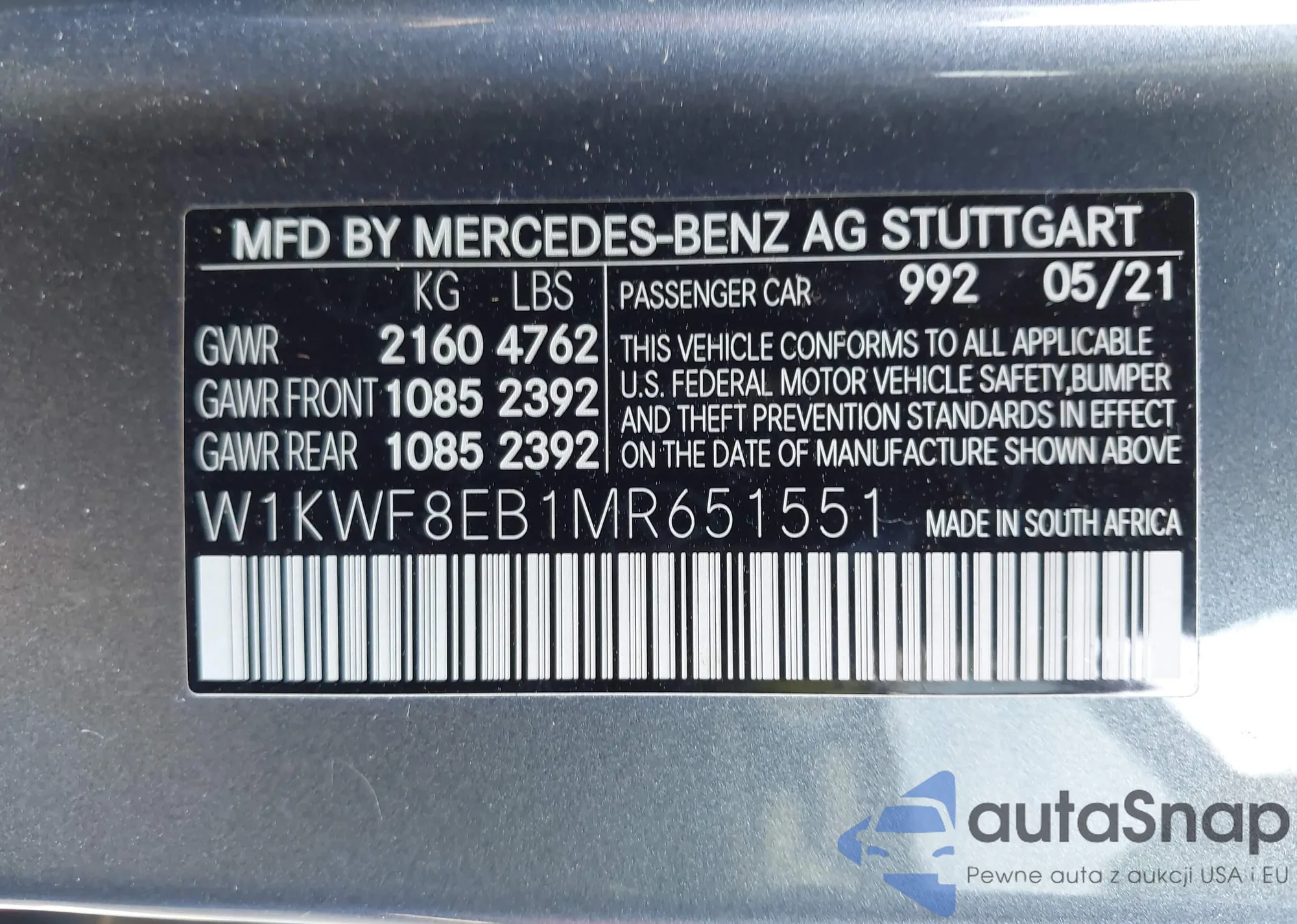 Автомобиль Mercedes-Benz C-klasse 2021 (VIN W1KWF8EB1MR651551) ранее не участвовал в торгах. Документы чистые, пробег соответствует или ниже среднего по рынку. Продаётся страховой компанией — рекомендуем покупку. Доставка в порт займет около 6–8 недель.