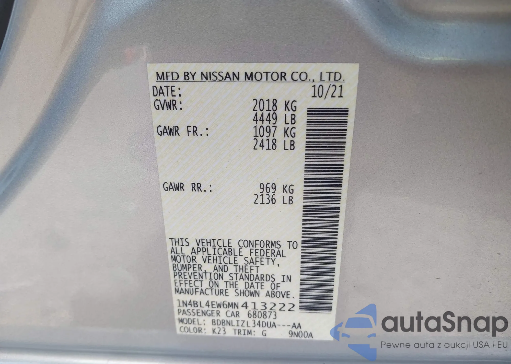 VIN: 1N4BL4EW6MN413222