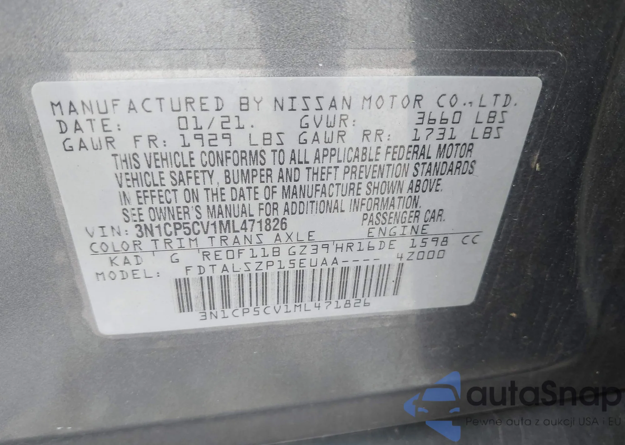Автомобиль Nissan Kicks 2021 (VIN 3N1CP5CV1ML471826) имеет документы, препятствующие регистрации. Могут возникнуть сложности при экспорте и регистрации. Обратитесь к экспертам AutaSnap для поиска альтернатив.