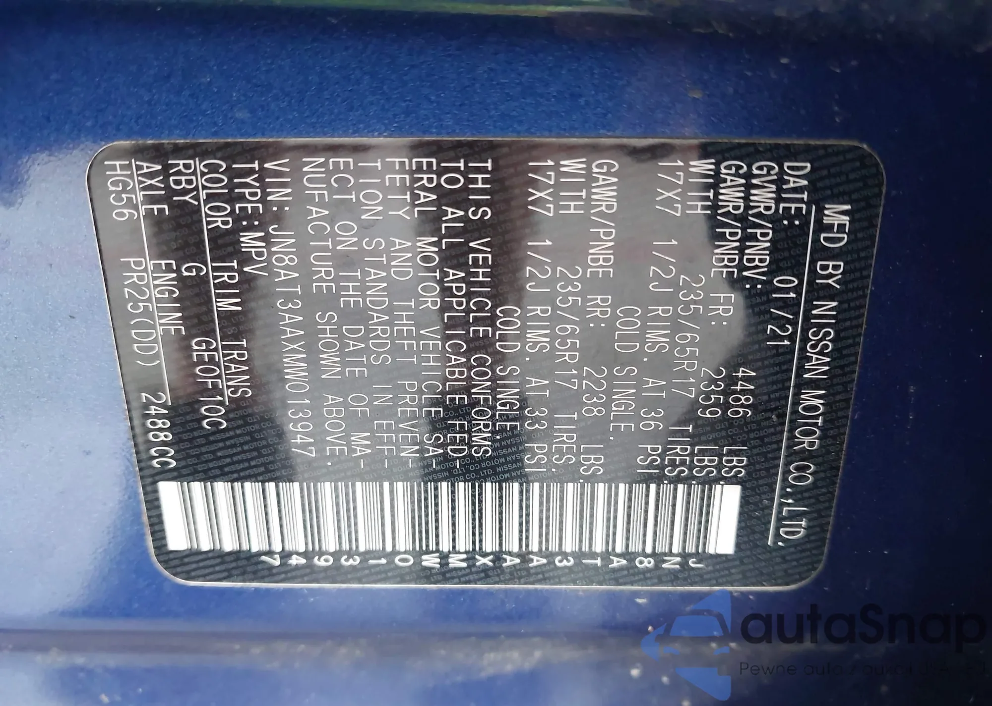 Автомобиль Nissan Rogue 2021 (VIN JN8AT3AAXMW013947) имеет документы, препятствующие регистрации. Могут возникнуть сложности при экспорте и регистрации. Обратитесь к экспертам AutaSnap для поиска альтернатив.