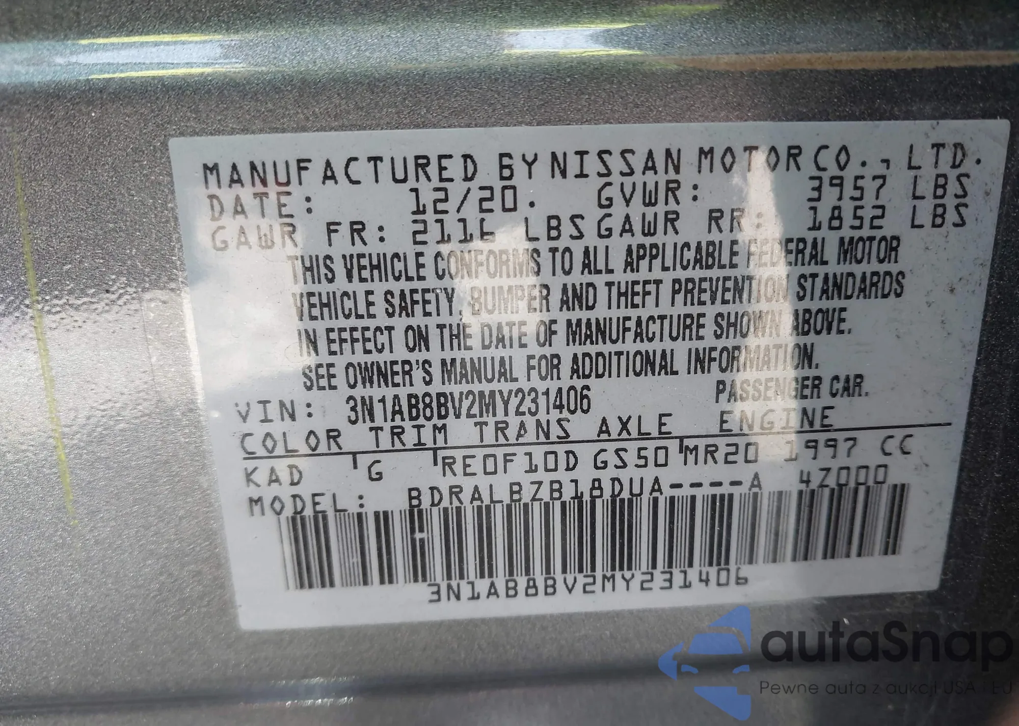 VIN: 3N1AB8BV2MY231406